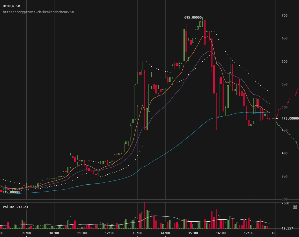 Ik verwacht ook dat het nog gaat in elkaar gaat storten, maar dat is puur omdat de wallets op exchanges nog niet werken (je kan nog steeds niks naar de BCC wallet sturen op Bittrex)