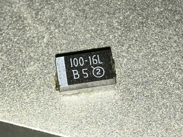 Het is een SMD component, ongeveer 7x4mm groot. Heeft twee vlakken aan de print zijde en de markeringen '100-16L' en 'B5 (2)'. Foto: