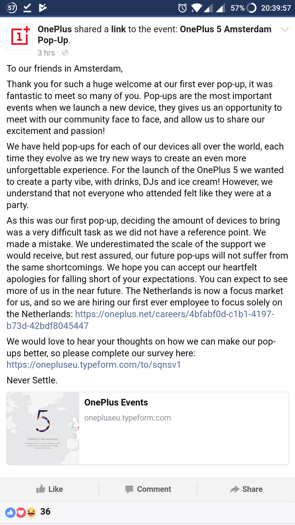 Meh, ik vind niet dat ze dat zeggen.. ze zeggen dat ze Nederland gewoon compleet verkeerd hebben ingeschat als afzet markt en dat ze nu wel beseffen dat hier een grote groep is die oneplus kent/wil hebben. En dat gaan ze onder andere oplossen door iemand aan te nemen die zich focussen op Nederland (die is er dus ook nog niet, maar ze zoeken iemand)Verwijderd schreef op zondag 25 juni 2017 @ 01:14: