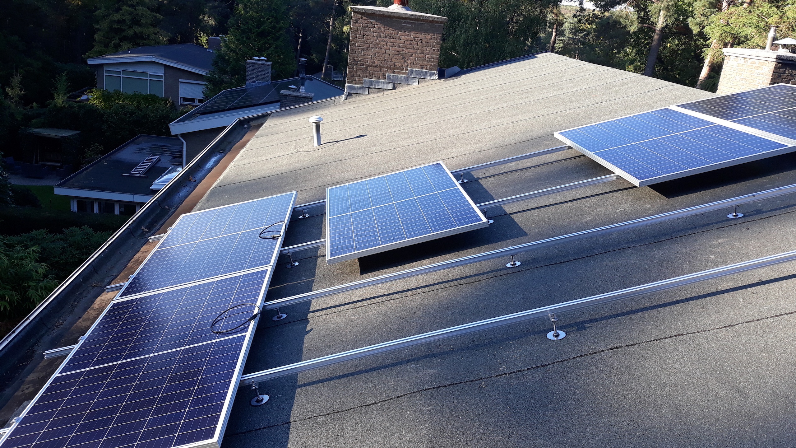 Work in progress. 10 stuks half-cell poly in landscape op het schuine bitumen dak.
