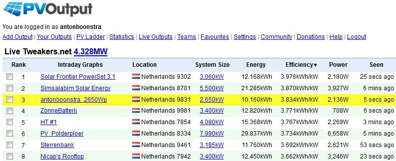 Dit vind ik nogal forse verschillen, normaal zit er bij mij tot max 200 Watt per dag verschil tussen de metingen van PVOUTPUT en wat solarweb weergeeft. Dat op opwekkingen van 20 tot 45KW per dag is dus 0,5 tot 1% afwijking.Darkfreak schreef op donderdag 14 september 2017 @ 16:28: