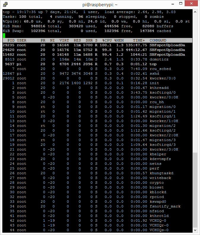| Tasks: 94 total, 2 running, 92 sleeping, 0 stopped, 0 zombie %Cpu(s): 22.7 us, 2.9 sy, 0.0 ni, 74.2 id, 0.1 wa, 0.0 hi, 0.1 si, 0.0 st KiB Mem: 948016 total, 109176 used, 838840 free, 13756 buffers KiB Swap: 102396 total, 0 used, 102396 free, 55132 cached PID USER PR NI VIRT RES SHR S %CPU %MEM TIME+ COMMAND 2413 root 20 0 16168 11m 5660 R 99.7 1.3 3:59.06 SBFspotUploadDa 2322 root 20 0 154m 10m 8880 S 3.0 1.2 0:25.10 domoticz 7 root 20 0 0 0 0 S 0.3 0.0 0:00.64 rcu_sched 31 root 20 0 0 0 0 S 0.3 0.0 0:03.08 kworker/0:1 2608 pi 20 0 4704 2480 2116 R 0.3 0.3 0:06.06 top 1 root 20 0 2176 1276 1168 S 0.0 0.1 0:00.97 init 2 root 20 0 0 0 0 S 0.0 0.0 0:00.00 kthreadd 3 root 20 0 0 0 0 S 0.0 0.0 0:00.19 ksoftirqd/0 5 root 0 -20 0 0 0 S 0.0 0.0 0:00.00 kworker/0:0H 6 root 20 0 0 0 0 S 0.0 0.0 0:00.32 kworker/u8:0 8 root 20 0 0 0 0 S 0.0 0.0 0:00.00 rcu_bh 9 root rt 0 0 0 0 S 0.0 0.0 0:00.02 migration/0 10 root rt 0 0 0 0 S 0.0 0.0 0:00.02 migration/1 11 root 20 0 0 0 0 S 0.0 0.0 0:00.03 ksoftirqd/1 13 root 0 -20 0 0 0 S 0.0 0.0 0:00.00 kworker/1:0H 14 root rt 0 0 0 0 S 0.0 0.0 0:00.02 migration/2 15 root 20 0 0 0 0 S 0.0 0.0 0:00.07 ksoftirqd/2 17 root 0 -20 0 0 0 S 0.0 0.0 0:00.00 kworker/2:0H 18 root rt 0 0 0 0 S 0.0 0.0 0:00.01 migration/3 19 root 20 0 0 0 0 S 0.0 0.0 0:00.02 ksoftirqd/3 21 root 0 -20 0 0 0 S 0.0 0.0 0:00.00 kworker/3:0H 22 root 0 -20 0 0 0 S 0.0 0.0 0:00.00 khelper 23 root 20 0 0 0 0 S 0.0 0.0 0:00.00 kdevtmpfs 24 root 0 -20 0 0 0 S 0.0 0.0 0:00.00 netns 25 root 0 -20 0 0 0 S 0.0 0.0 0:00.00 perf 26 root 20 0 0 0 0 S 0.0 0.0 0:00.00 khungtaskd 27 root 0 -20 0 0 0 S 0.0 0.0 0:00.00 writeback |