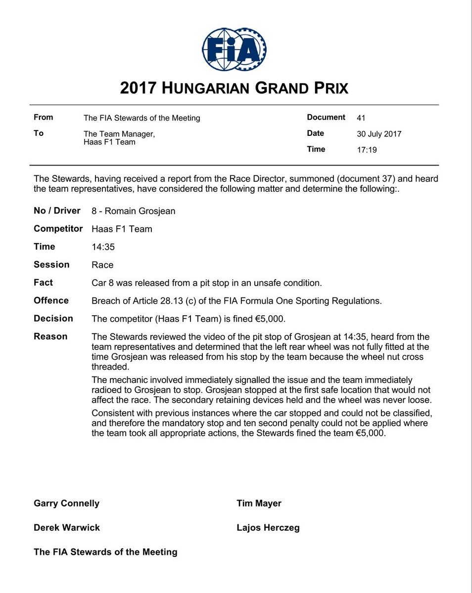 Wacht, mocht men hem naar de pits hebben kunnen brengen om een nieuwe band te monteren had men een simpele 10s straf gekregen en verder niets? Dan klinkt die €5000 ineens wel als veel geld voor een wagen die toch buiten de punten ging finishen vandaag.nachtnet schreef op zondag 30 juli 2017 @ 17:45:
