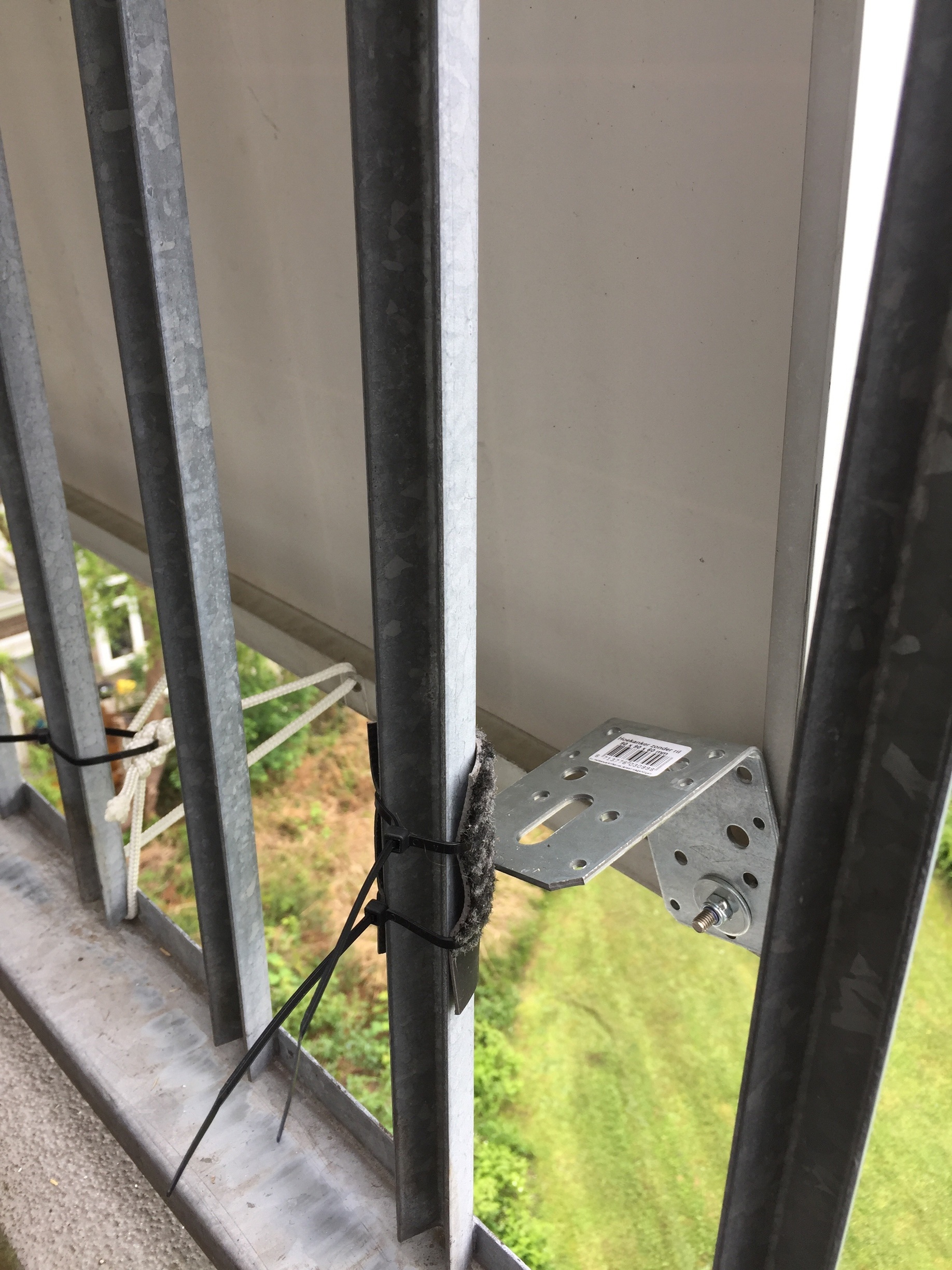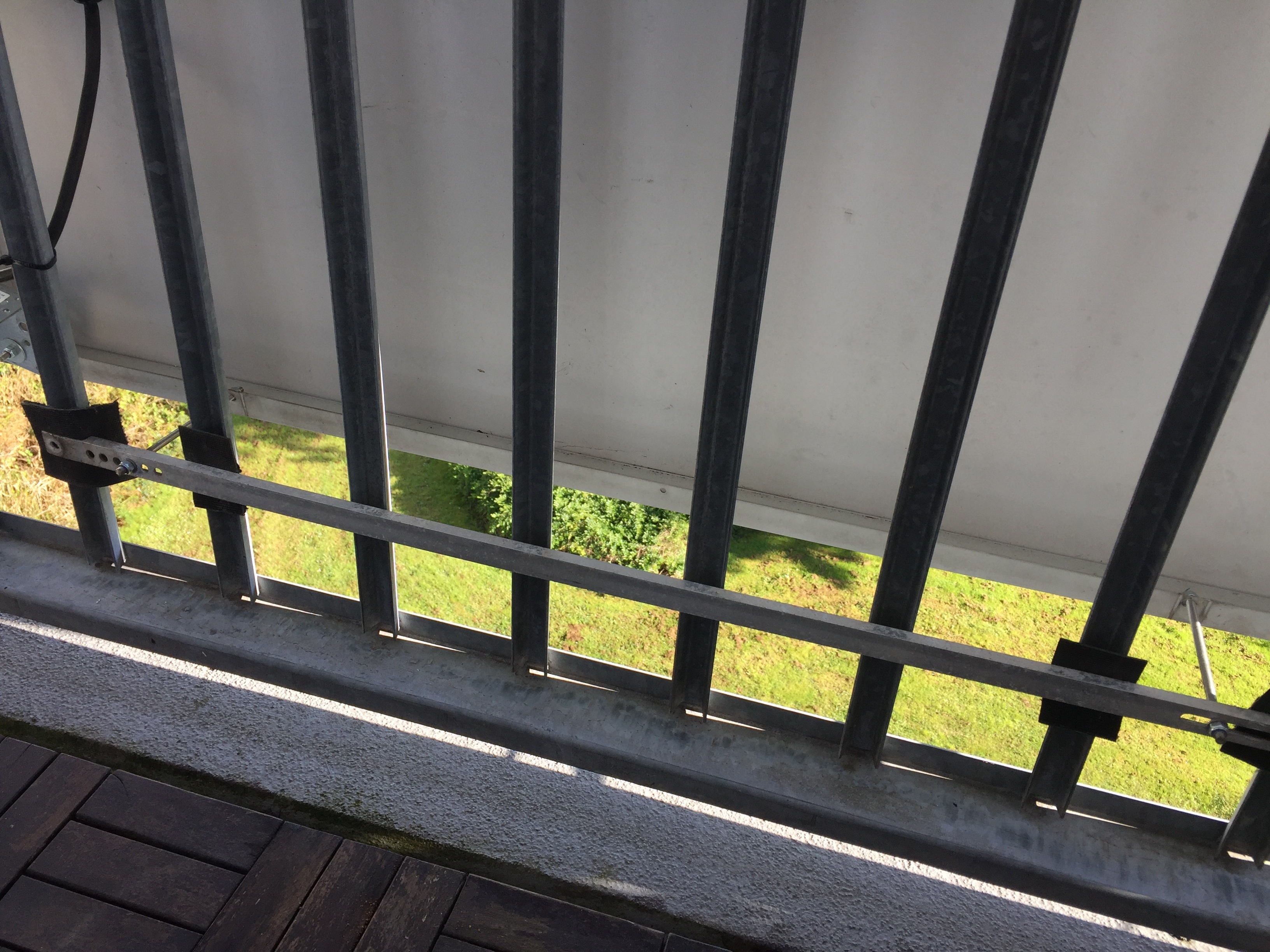 Ik wil de panelen aan de buiten zijde van de balustrade monteren. Omdat het daar best kan waaien zoek ik stevige bevestiging. Idee zou zijn een bevestiging die aan de achterkant klemt (4 per paneel?) op de metalen spijlen van de balustrade.