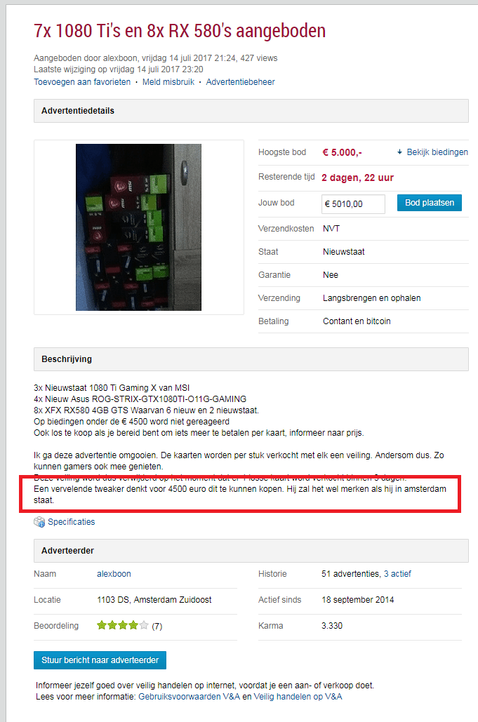 Ik wil niet heel vervelend zijn, maar je schrijft dat je op biedingen onder de €4500,- niet reageert, iemand biedt €4500 en dan is het nog niet goed noem je hem gelijk maar vervelend?