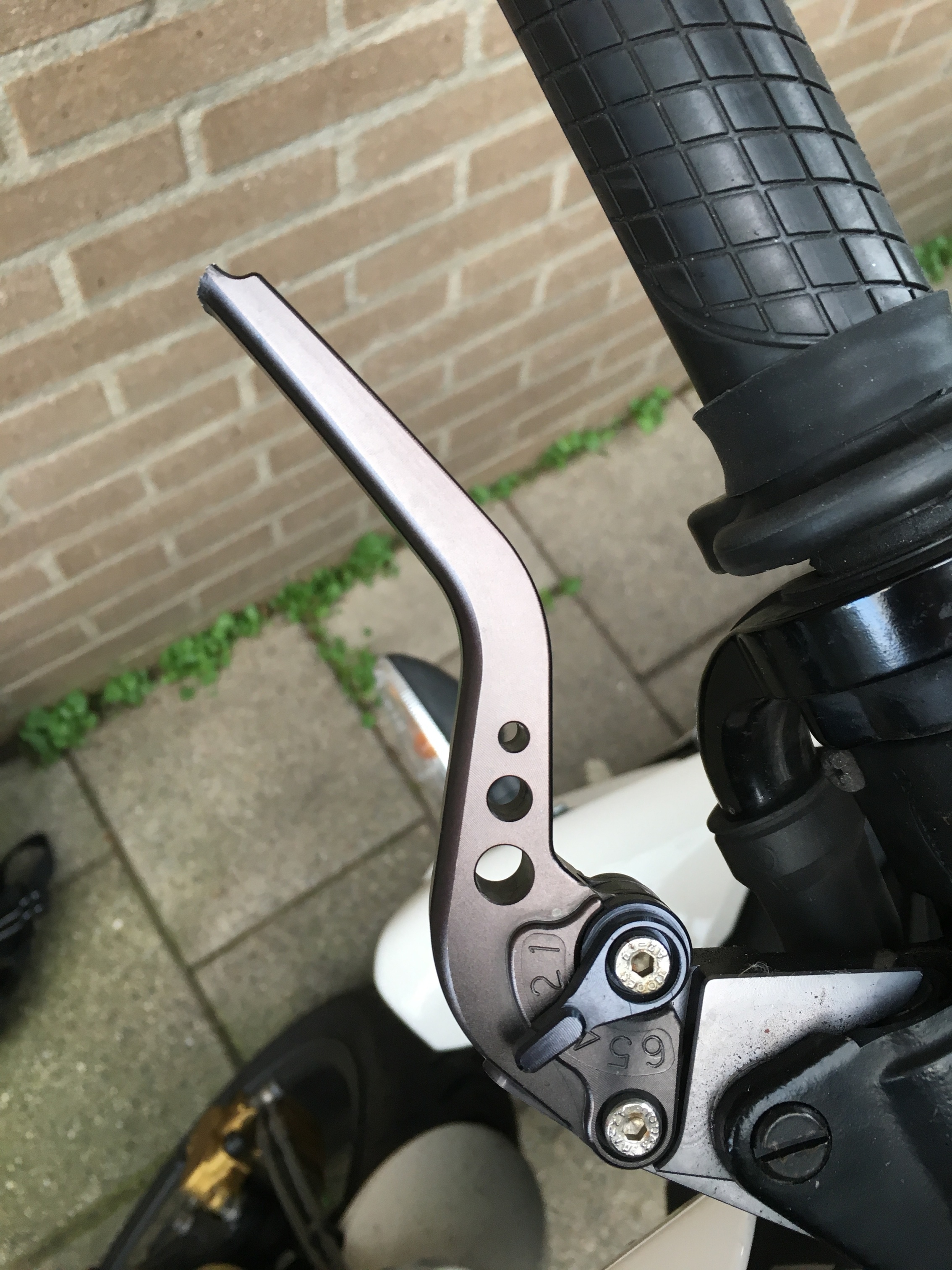 Als ik de hendel zo zie lijkt het mij een goedkope China hendel. Het heeft dan weinig zin om een nieuwe te bestellen omdat ze goedkoop zijn er per 2 komen. Heb zelf wat duurdere hendels omdat ik na China hendels toch maar eens voor iets heel moois gegaan ben. Dan betaal je natuurlijk veel meer, maar dan kan je ze ook los bestellen. Ik zou niet gaan zoeken naar een nieuwe hendel en ze gewoon beide vervangen door iets wat je mooi vind. Als je met 2 vingers remt en koppelt kan je ook korte hendels overwegen.dread schreef op donderdag 5 oktober 2017 @ 09:17:
