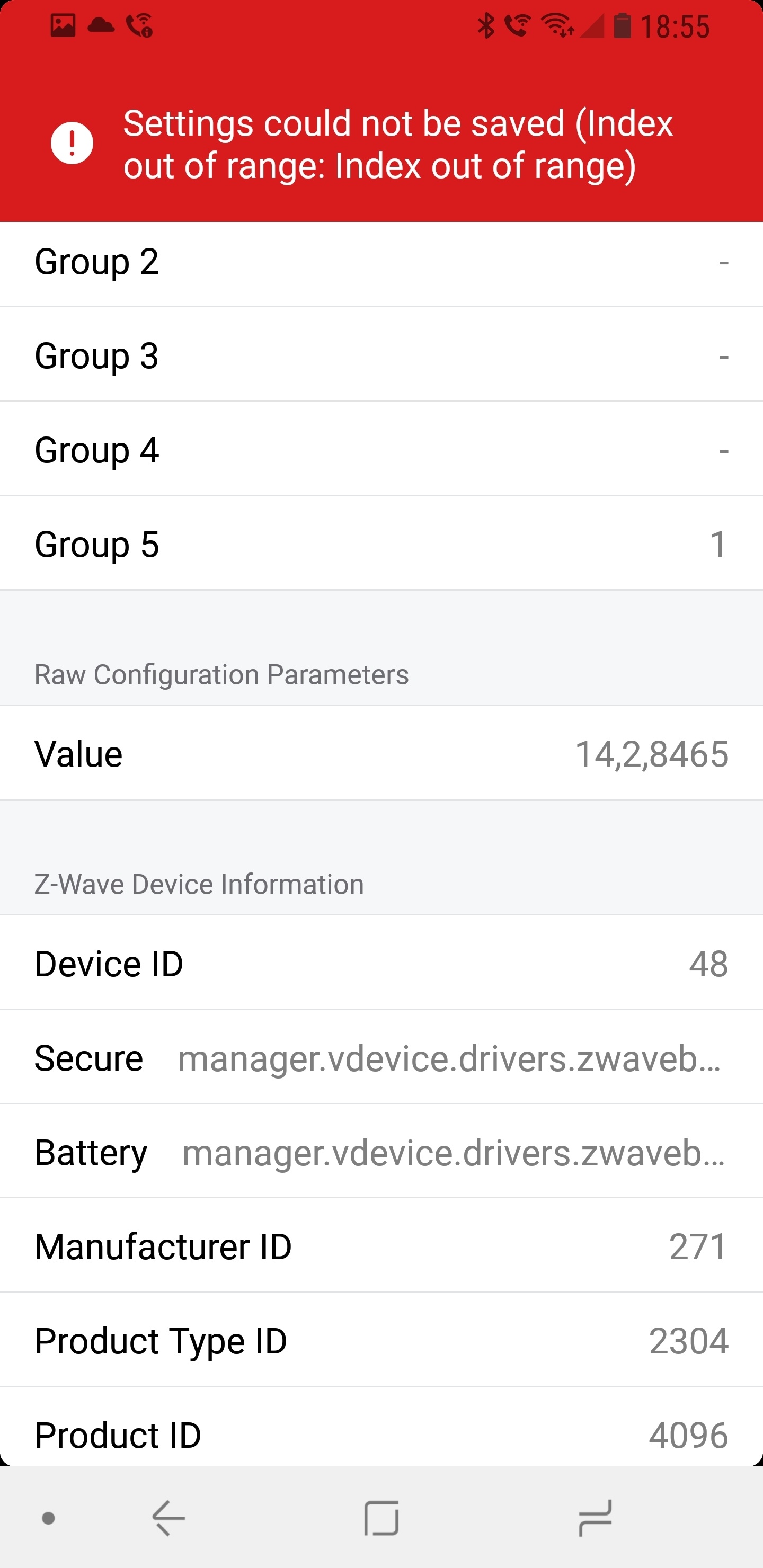 Echter, als ik dit letterlijk overneem in de Homey app onder de Raw Configuration Parameters, krijg ik een foutmelding "Index out of range".