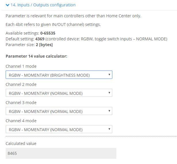 Ik probeer een setting van een Fibaro RGBW controller te veranderen. Specifiek setting 14, om input 1 de brightness te laten veranderen, ipv default het rode kanaal.