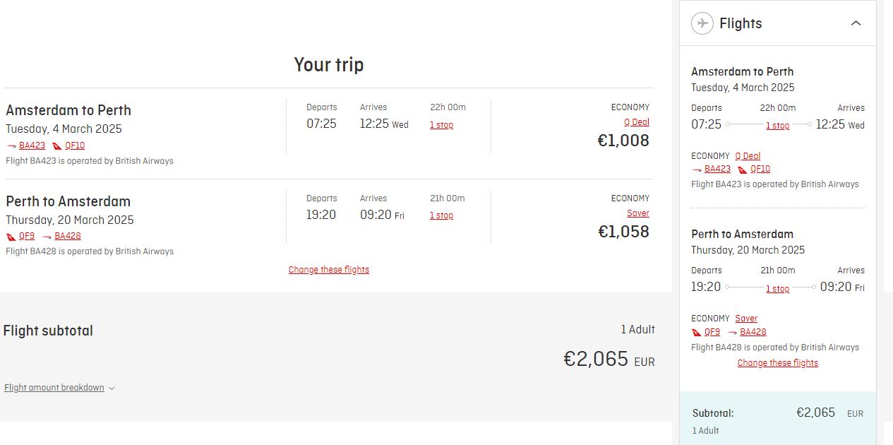 Ik heb via Qantas directe website gekeken en van Amsterdam naar Perth heeft hij ook beschikbaar en heeft dezelfde route van Amsterdam naar Londen en dan rechtstreeks naar Perth alles op 1 ticket. Ik ben opeens via Qantas rechtstreeks boeken meer dan €2.000 kwijt: