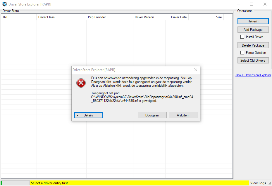 Ik was mijn laptop aan het opschonen en via SpaceSNiffer kwam ik te weten dat de FIleRepository enorm groot is, waaronder 14GiB van Nvidia drivers. Dan maar DriverStore Explorer (Rapr) gedownload. Wanneer ik deze open krijg ik direct een onverwachte uitzondering. Is er een manier om deze fout op te lossen of om de nvidia mappen toch te verwijderen? Noot: ik draai DriverStore Explorer uiteraard als administrator!