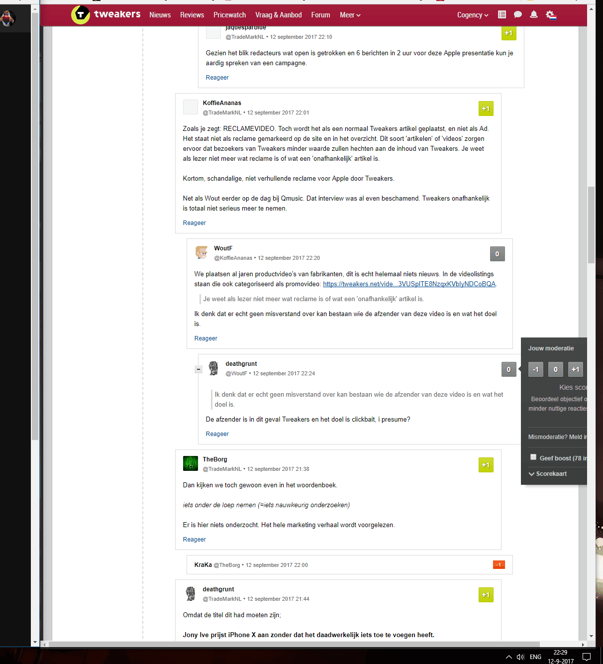 Ik hoop dat dit het goede subforum is. Ik zit regelmatig met twee browsers open(ultra wide 1440p, Google Chrome), links speelt een (youtube) filmpje af in dit geval en rechts browse ik er vrolijk op los. Zo ook op Tweakers, en soms draag ik dan mijn moderatiesteentje bij op de frontpage.