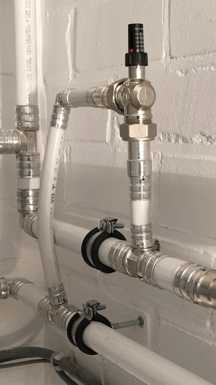 Nu onder de boilers en aan de 6-wegkleppen in de appartementen koper met profipress, in de technische ruimte staal, boven de plafonds kunststof, je kunt met ons alle kanten op