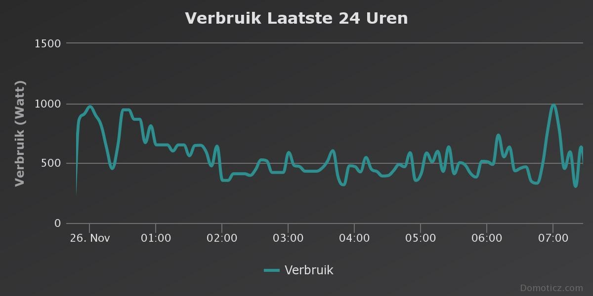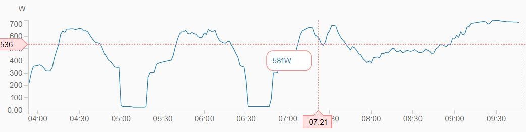 Bij mij gaat de WP pas om 08:00 aan, dus die grafiek van vanochtend is niet helemaal representatief, en zal zakken als het systeem is opgewarmd naar +- 1000Watt (hij moet eerst "ff" pokkelen om de boel op temperatuur te krijgen). Op dit moment trekt de WP 1436Watt en zakkende