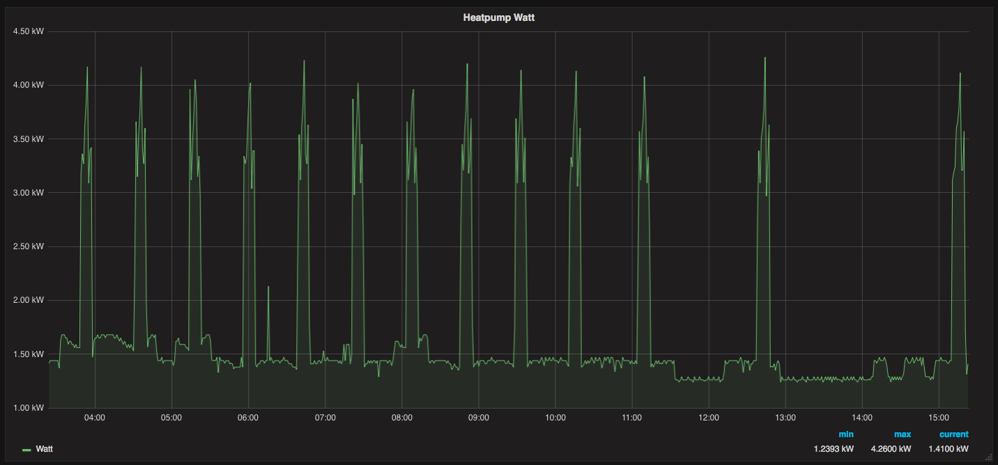 De pieken tot 1500W treden op bij optoeren van de buitenunit. Heel erg veel onderbrekingen terwijl de thermostaat heel traag is, dus niet veroorzaakt door ruimteregeling.