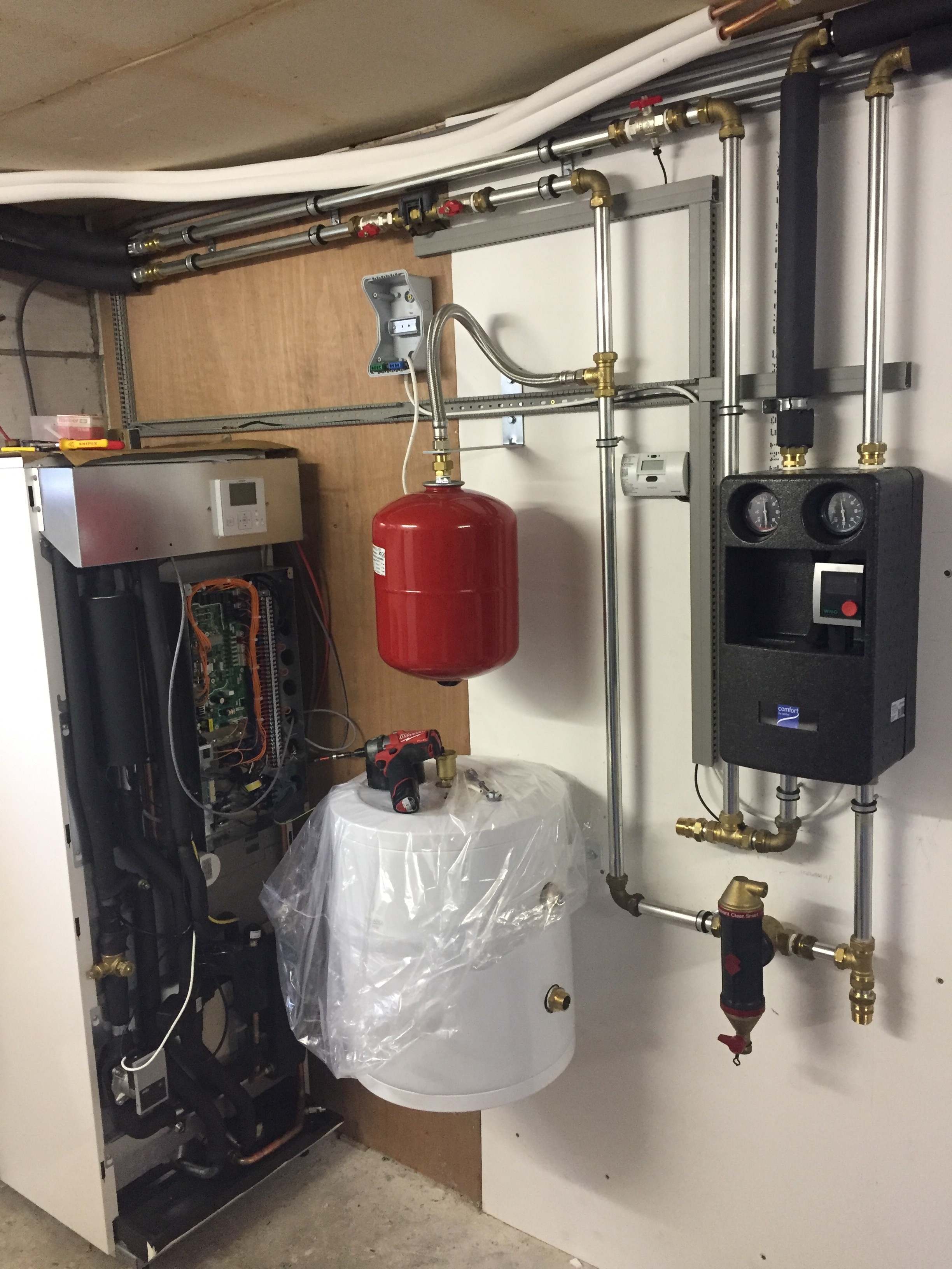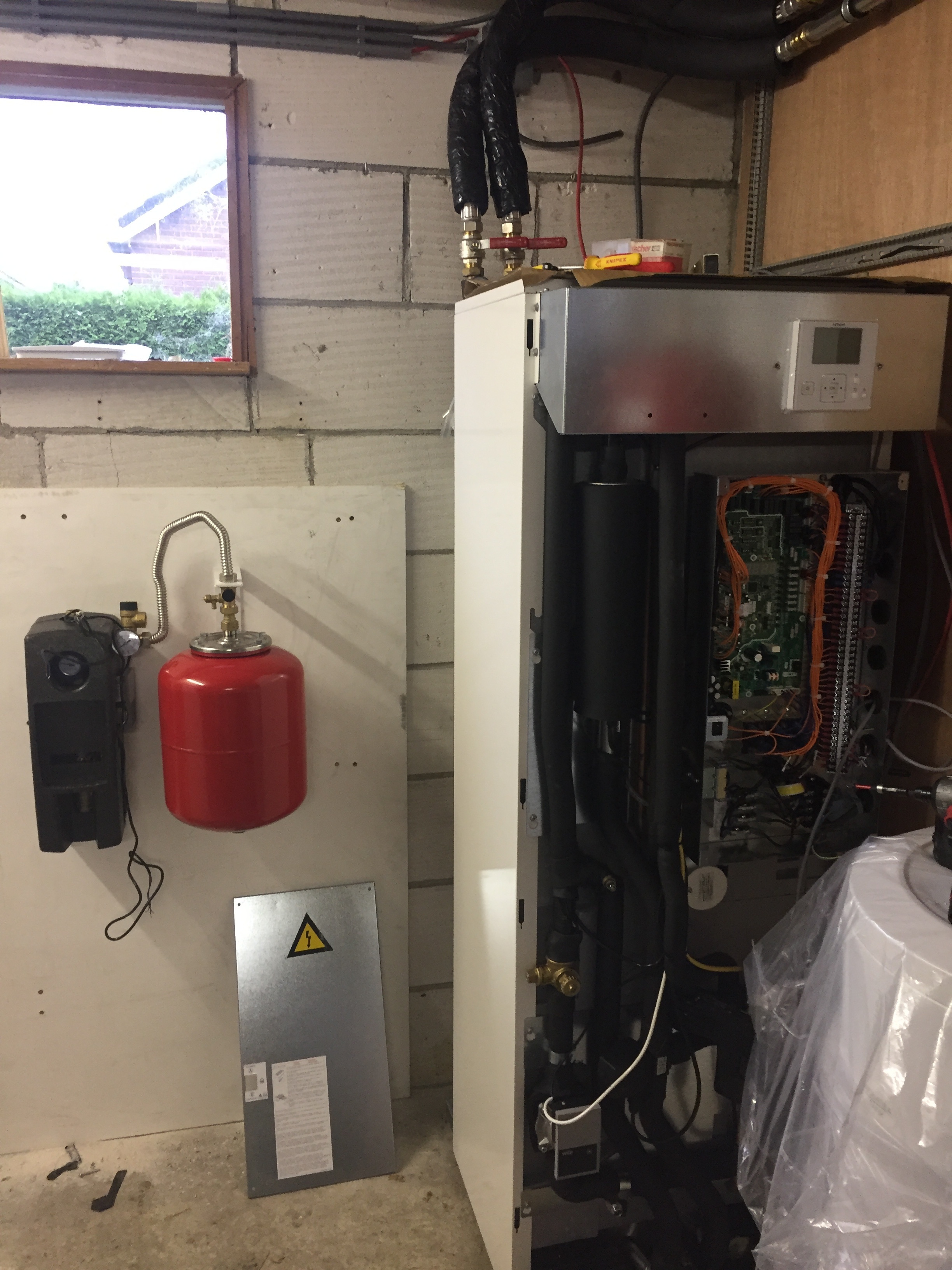 De STEK man mag vrijdag de boel aansluiten. Nog 2 flexibele buisjes tussen het buffervat en het aan en afvoer circuit, de qsolar afkoppelen. Ohja en niet te vergeten DHW moet ook nog even aangesloten worden met de inlaatcombinatie en het mengventiel(ivm solar)