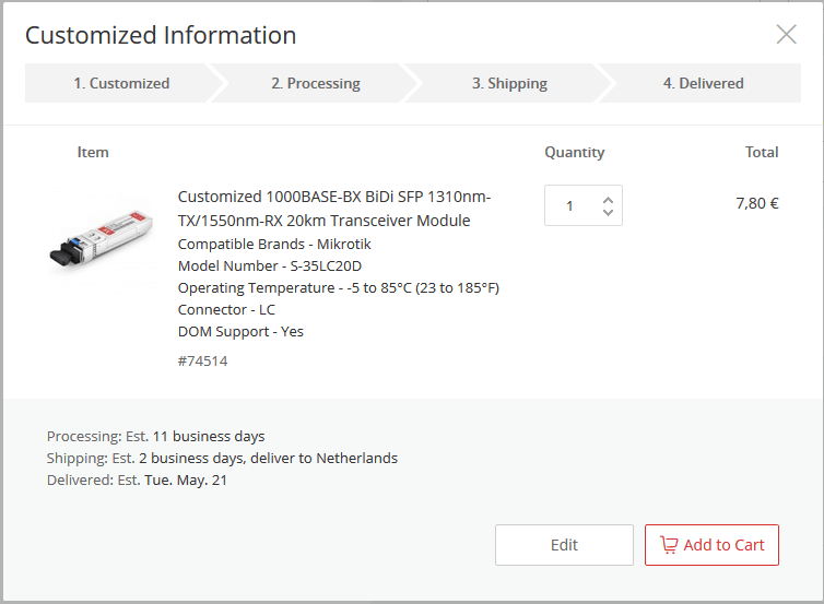 Als connector optie heb ik de LC variant gekozen en bij de SFP deze kabel besteld: