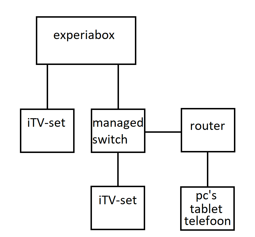 Ik heb een KPN VDSL-verbinding thuis, waarbij ik momenteel de Experiabox als modem en router gebruik. Ik ben bezig met het updaten van mijn netwerk in huis (2 kamer-appartement, 75 m2), omdat de experiabox van KPN gewoon niet voldoende WiFi-signaal produceert om mijn appartement van stabiele WiFi te voorzien, en omdat ik wat meer controle wil hebben over wat er binnen mijn huis gebeurt. Momenteel heb ik vanaf de experia-box 2 kabels door het huis getrokken, 1 naar de slaapkamer voor iTV en 1 naar de woonkamer, waar via een managed switch met IGMP Snooping het signaal verdeeld wordt tussen de iTV en de overige apparaten (computers, smart-TV, WiFi-access point omdat het experiabox-signaal matig is). Dit is natuurlijk niet bijzonder optimaal.