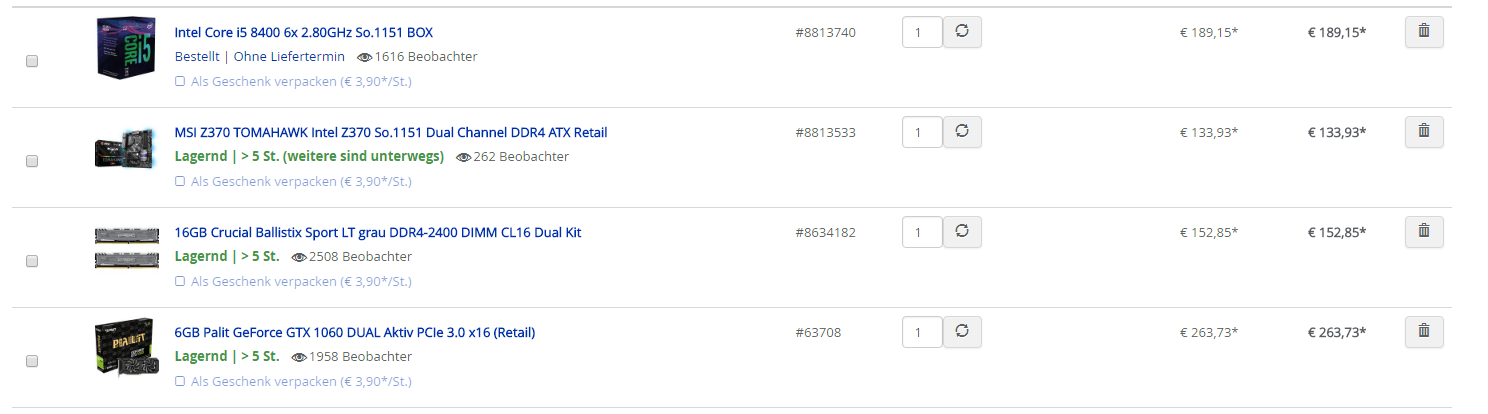 | 1 | Intel Core i5-8400 Boxed | € 187,50 | € 187,50 |