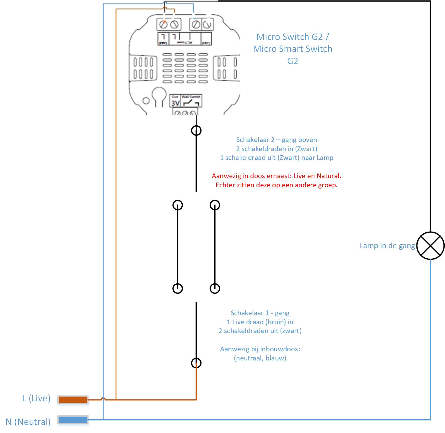 Als ik de documentatie van Aeon bekijk https://aeotec.freshdesk....itch-g2-wiring-schematics zou ik de Micro smart switch achter de tweede schakelaar moeten monteren. In mijn geval is dat boven bij de trap. Nu heeft alleen de smart switch ook een Live wire en neutral nodig. Deze zijn niet aanwezig bij de schakelaar in de doos zelf.