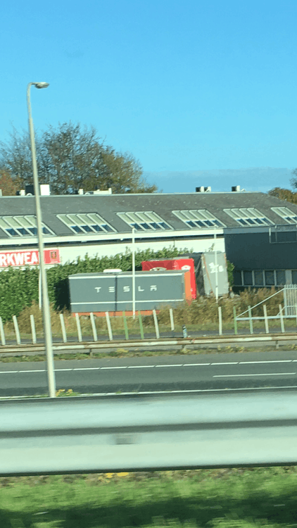 Het zit naast een bedrijf genaamt mascot wear op de rijksweg. Gewoon puur uit interessen iemand enig idee wat dit is? Misschien een nieuw oplaadpunt of iets dergelijks. Het is een container met tesla erop en erachter hangt een rode banner met het tesla logo.