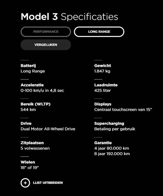 Model 3 met Long Range-batterij - 8 jaar of 192.000 km, wat het eerst van toepassing is, met behoud van ten minste 70% van de batterijcapaciteit gedurende de garantieperiode.