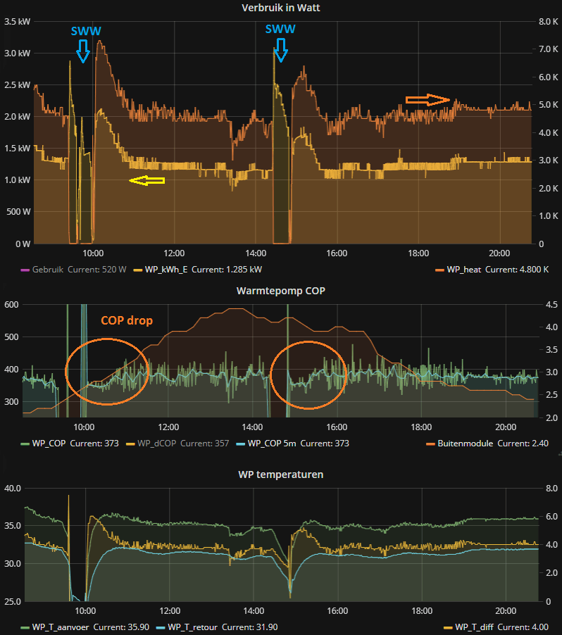 Pompstand verhoogd en het lijkt erop dat hij minder moeite heeft en dus nu draait met 1300 watt ipv 1450 gemiddeld bij Tb 2