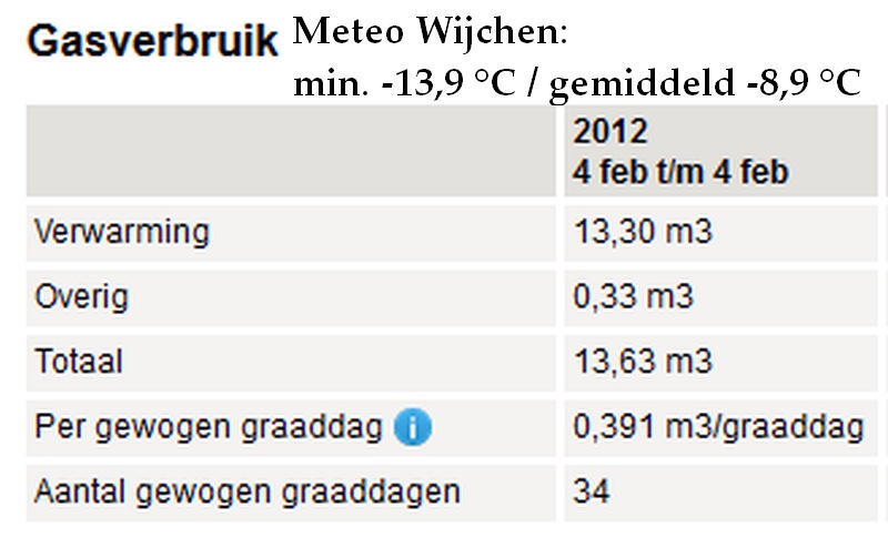 Het hoge verbruik t.o.v. normaal bij extreme koud zoals afgelopen week kan ik enigzins verklaren omdat bij extreme kou ook de hele bovenverdieping verwarmd wordt. Setpoint voor de slaapkamers is 18 graden, en tot deze week had ik nog nooit mee gemaakt dat de slaapkamers verwarmd werden, maar sinds deze week dus wel. Dus bijna een keer zoveel te verwarmen ruimtes kan naar mijn idee goed zorgen voor veel verbruik.