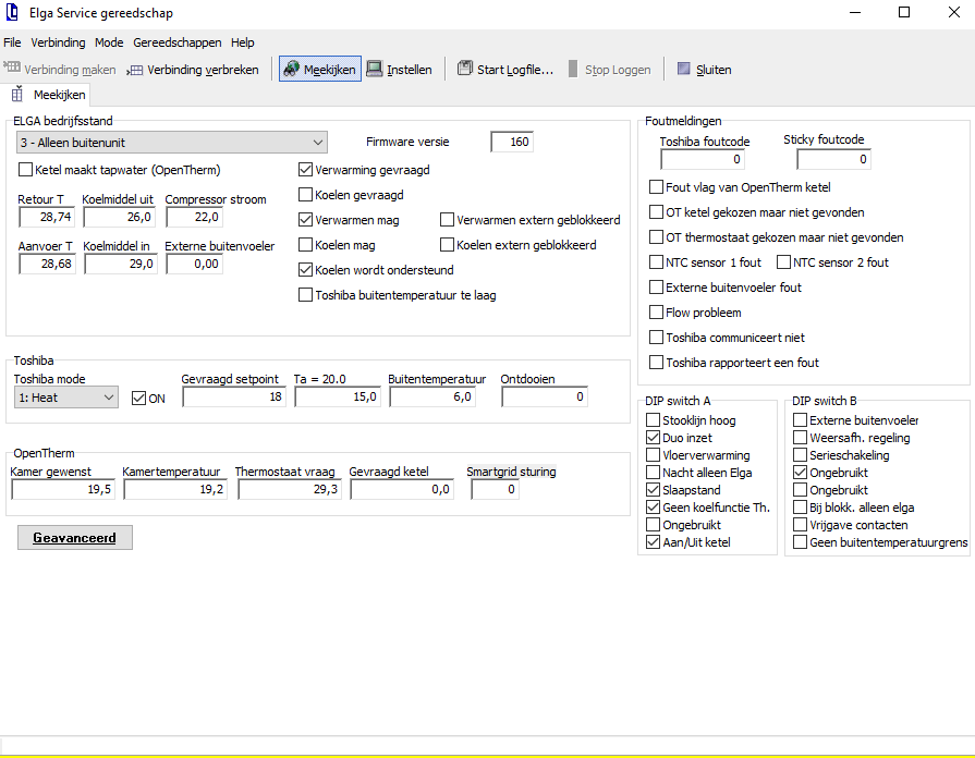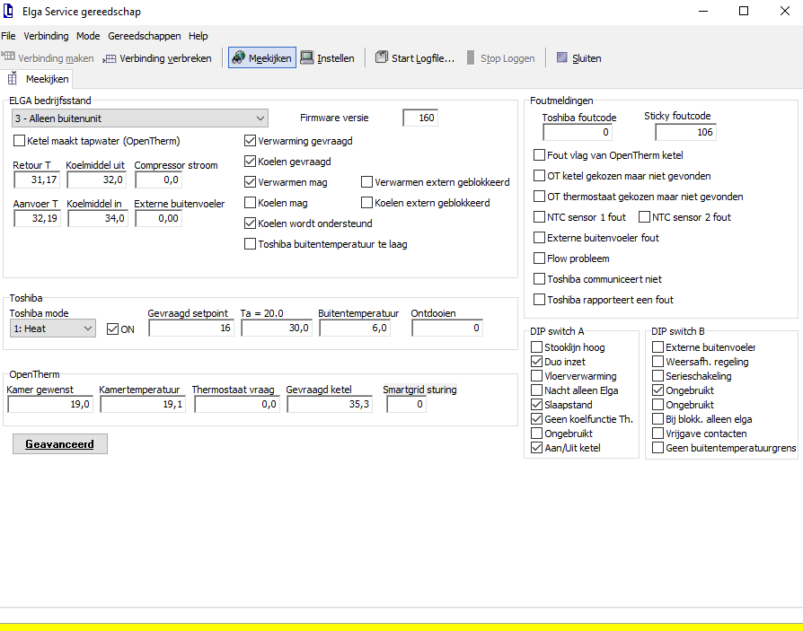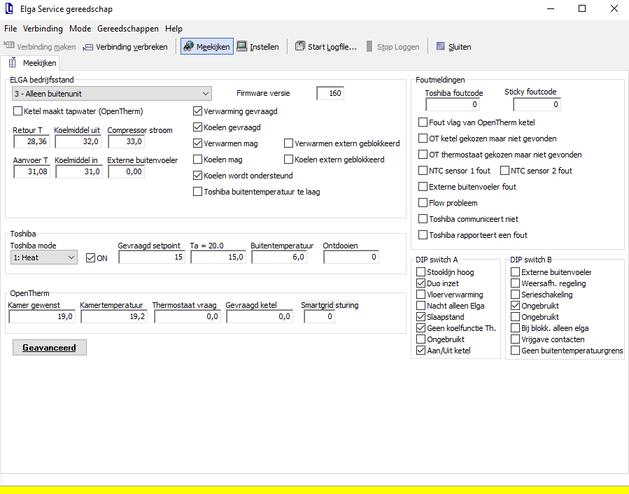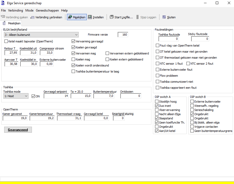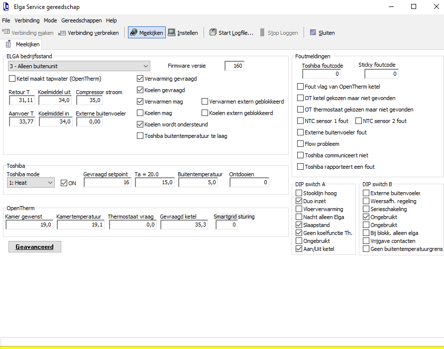 Verder zie ik koelmiddel en condensor temperaturen neem ik aan links boven. Het koelmiddel (de condensatie) moet altijd hoger in temperatuur zijn dan het water, anders wordt er geen warmte overgedragen. Hier zie ik het omgekeerde.