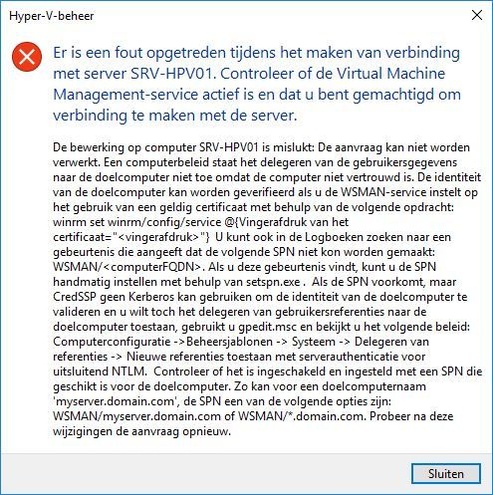 Echter, ik kan de server niet toevoegen binnen Hyper-V manager, dan krijg ik deze fout: