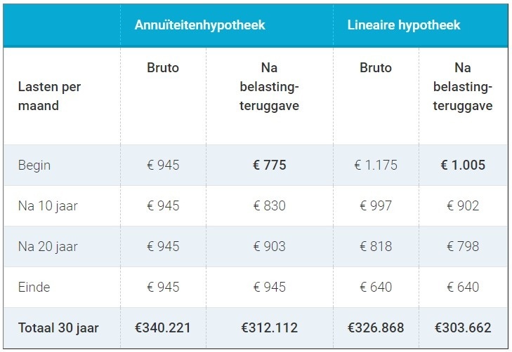 Ik lees online dat veel mensen kiezen voor annuiteit vanwege de stabiliteit en omdat in het begin de maandlasten minder hoog zijn. Nu is het waarschijnlijk zo dat mijn salaris nog wel gaat groeien, maar we werken allebei fulltime en zijn rond de 30 zonder kinderen. Ik denk dat we nu netto meer te besteden hebben dan als we rond de 40 zijn met een kind of twee en zij werkt parttime. Dan is het toch slimmer om nu juist hogere maandlasten te hebben, nu je het kan dragen?