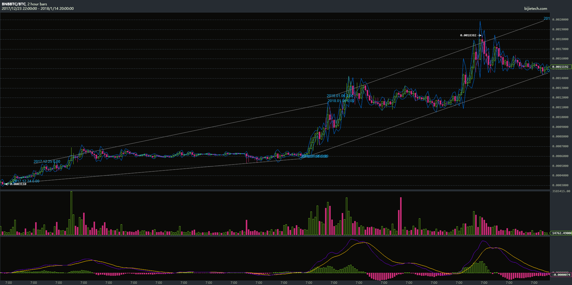 Ik gebruik zelf wel BNB, maar heb nog wat restjes over van de tijd voor BNB. Goeie tip van je om de koers van BNB eens in de gaten te houden. Zelf hoop ik vannacht op een stijging van ICX/BTC. De MACD/CCI/BOLL zien er goed uit, maar zou ook kunnen dat de stijging er voor vandaag wel een beetje uit is. Er staan wel een paar flinke sell orders en het volume van de laatste paar uur is niet echt hoog.MAX3400 schreef op zondag 14 januari 2018 @ 21:18: