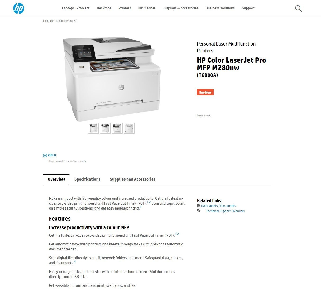 Gisteren heb ik van Printabout.nl een HP M280nw printer ontvangen. Ik had dit model en de webshop gevonden via de pricewatch. Een van mijn eisen was automatisch dubbelzijdig printen. Volgens de Tweakers productpagina en de HP pagina (zie screenshots) zou dit model hier ondersteuning voor moeten bieden.