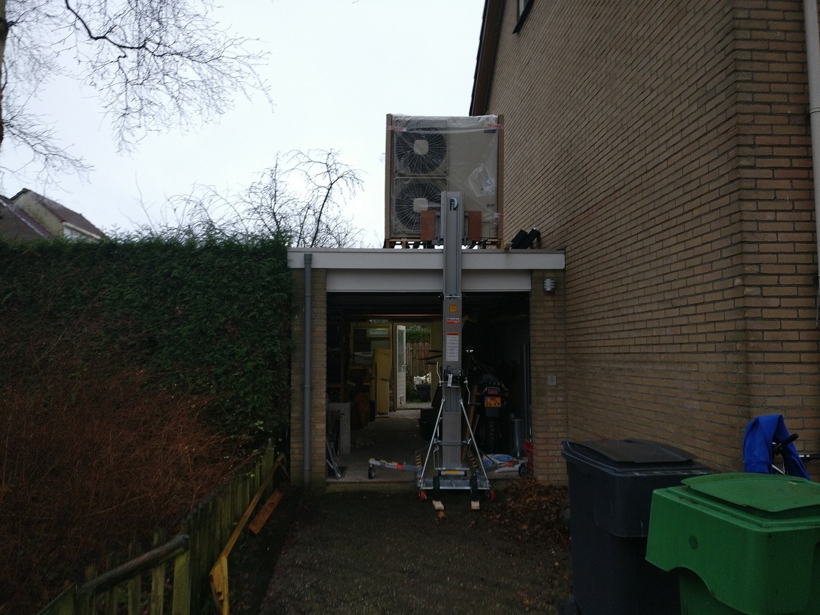 Sinds 2,5 jaar hebben wij een Panasonic split warmtepomp met buitenunit model WH-UD09FE8. Dit is een model met 2 ventilatoren boven elkaar, dus een flinke jongen en weegt ongeveer 100kg.