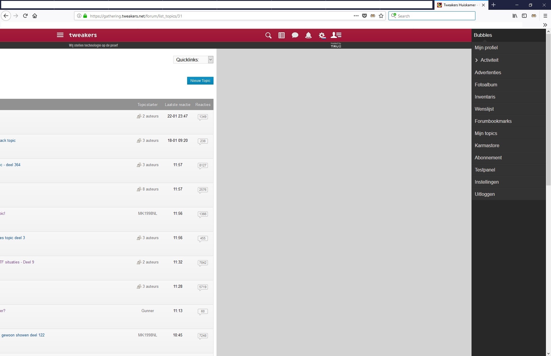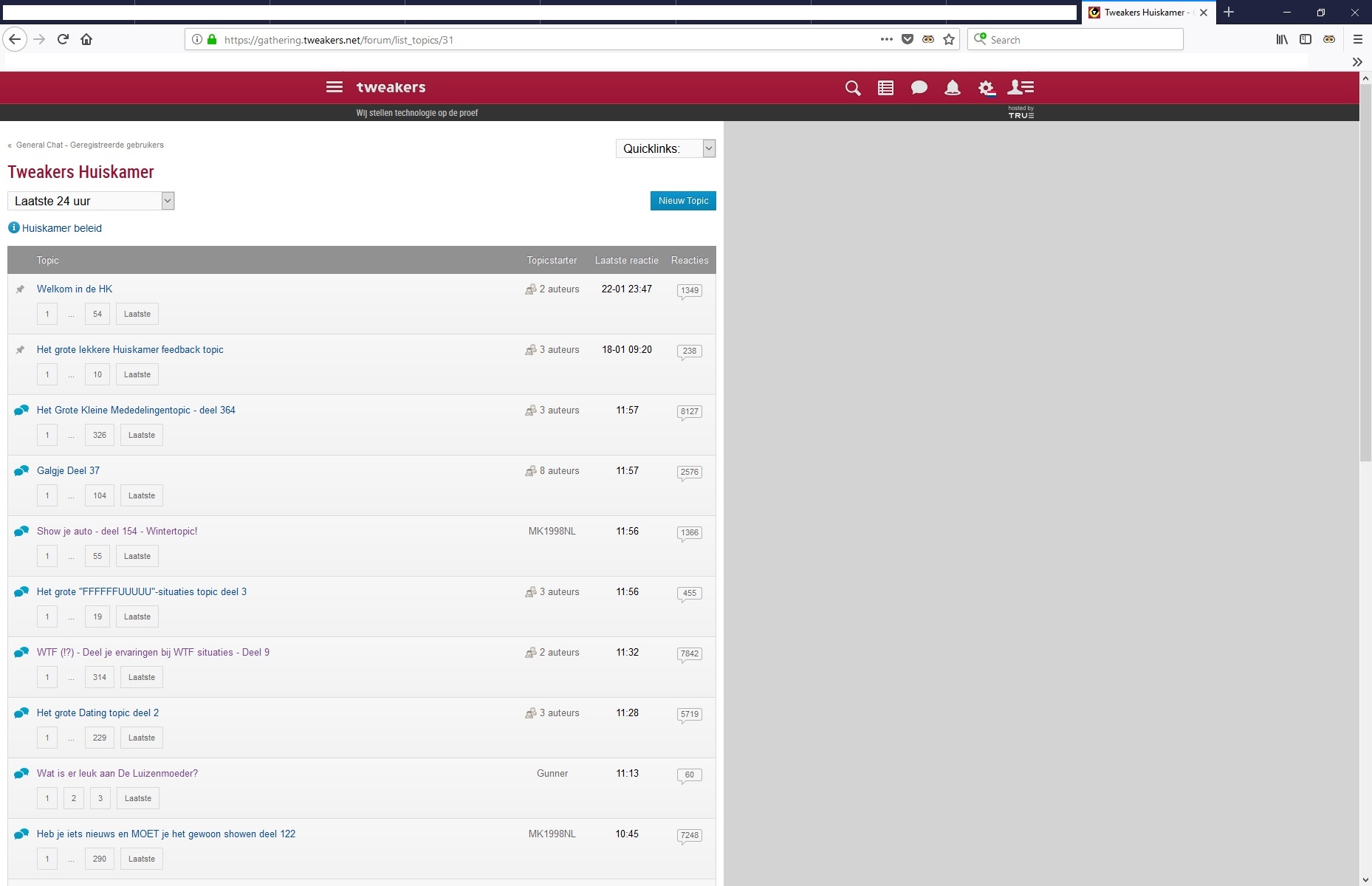 En kan er misschien wat gedaan worden aan de compactheid (of gebrek eraan) op het forum van de lijst van topics. Als er topics met meerdere pagina's worden gelist, kan je op een monitor van 1920*1200 op die manier maximaal ~10 topics onder elkaar zien. Prima voor als je op een mobile device zit en je moet bedienen met je vingers, maar op een desktop ben je flink aan het scollen terwijl je prima precies kan werken met een muis en de informatiedichtheid dus fors mag toenemen.