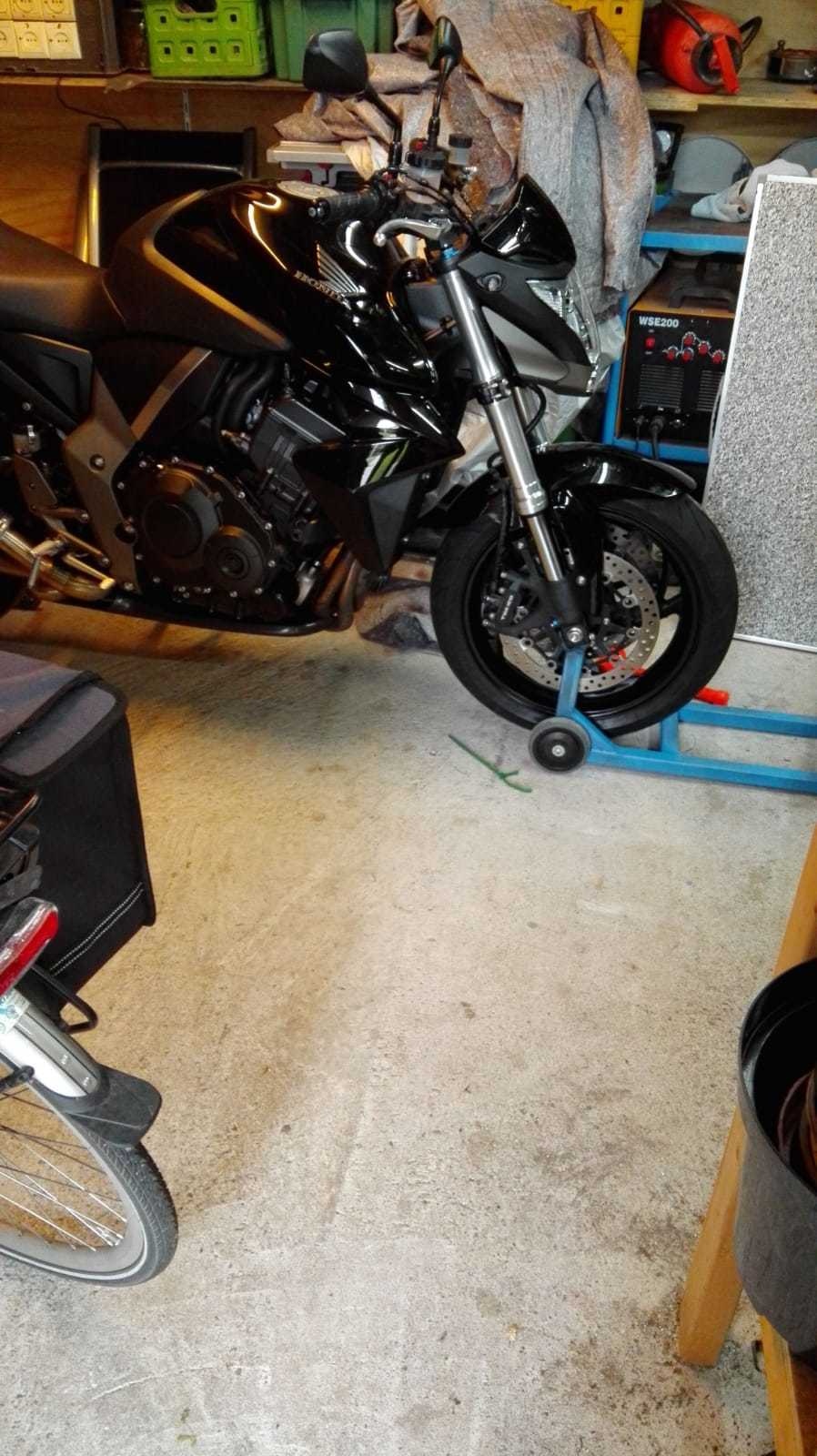 Ik bikkel nog even door, rijd een dorp in en vindt een ingang van een garage onder een flat waar de Fazert en ik samen droog staan.