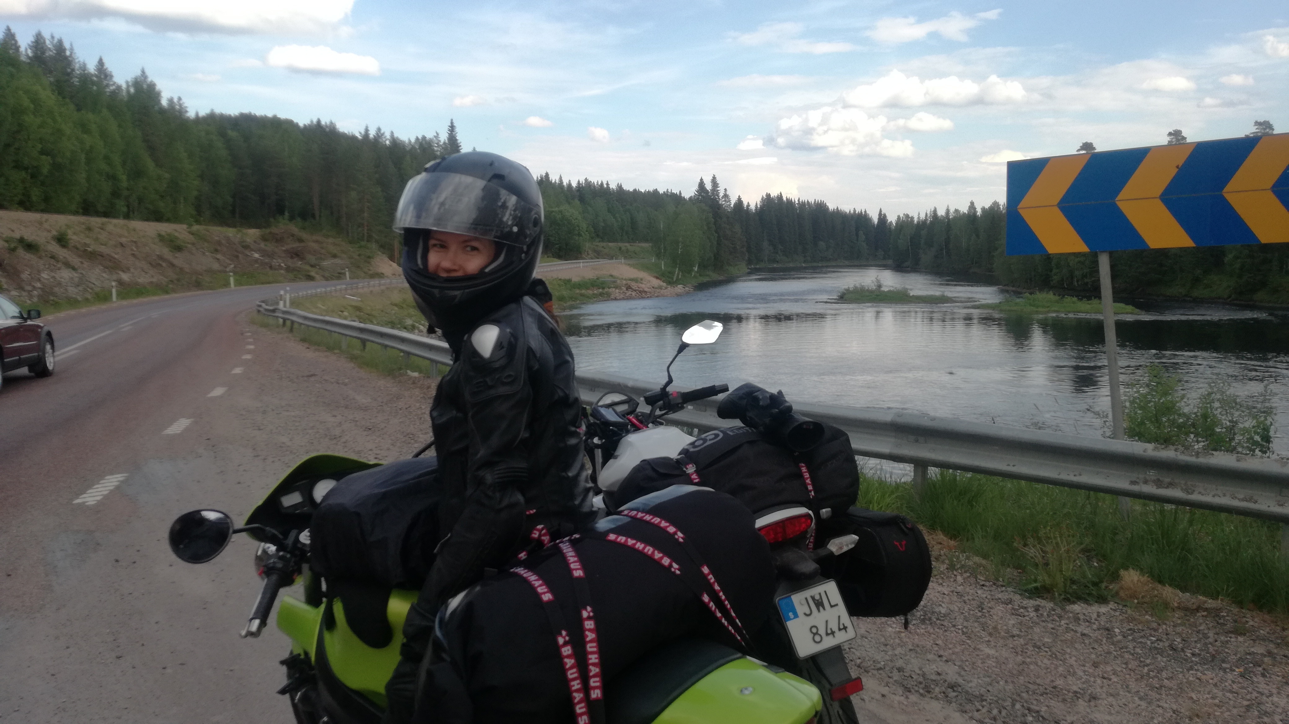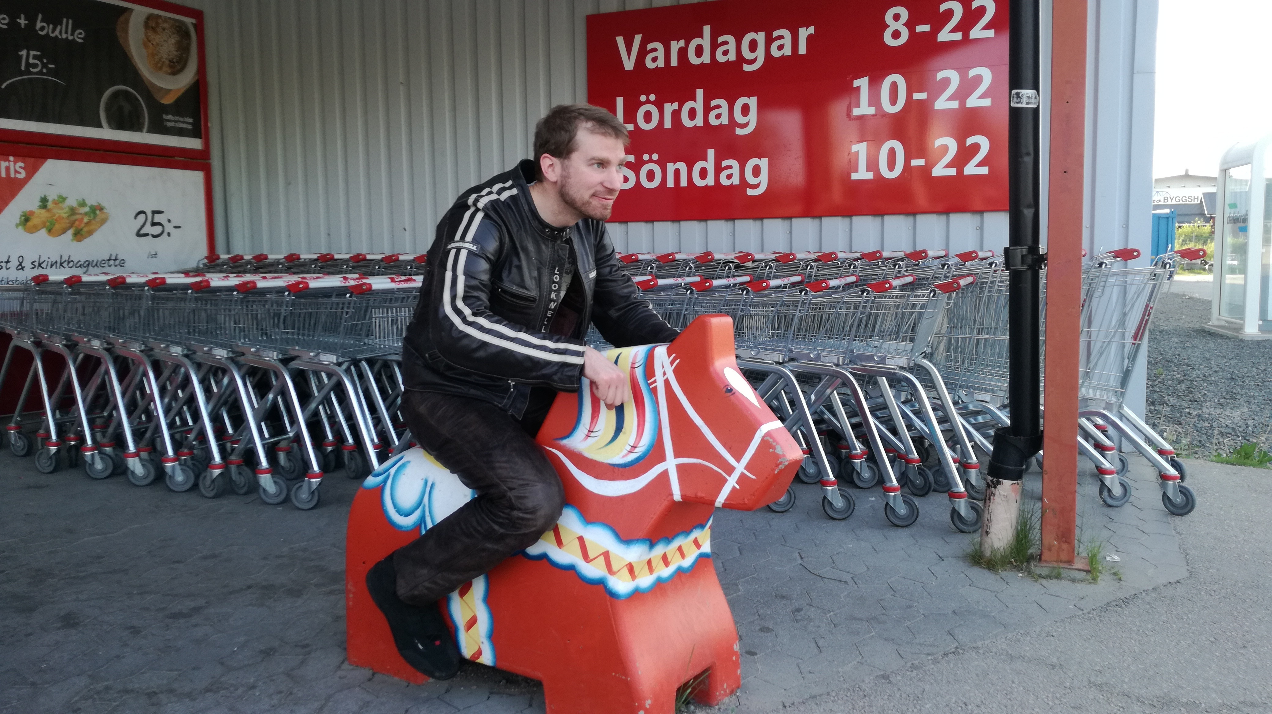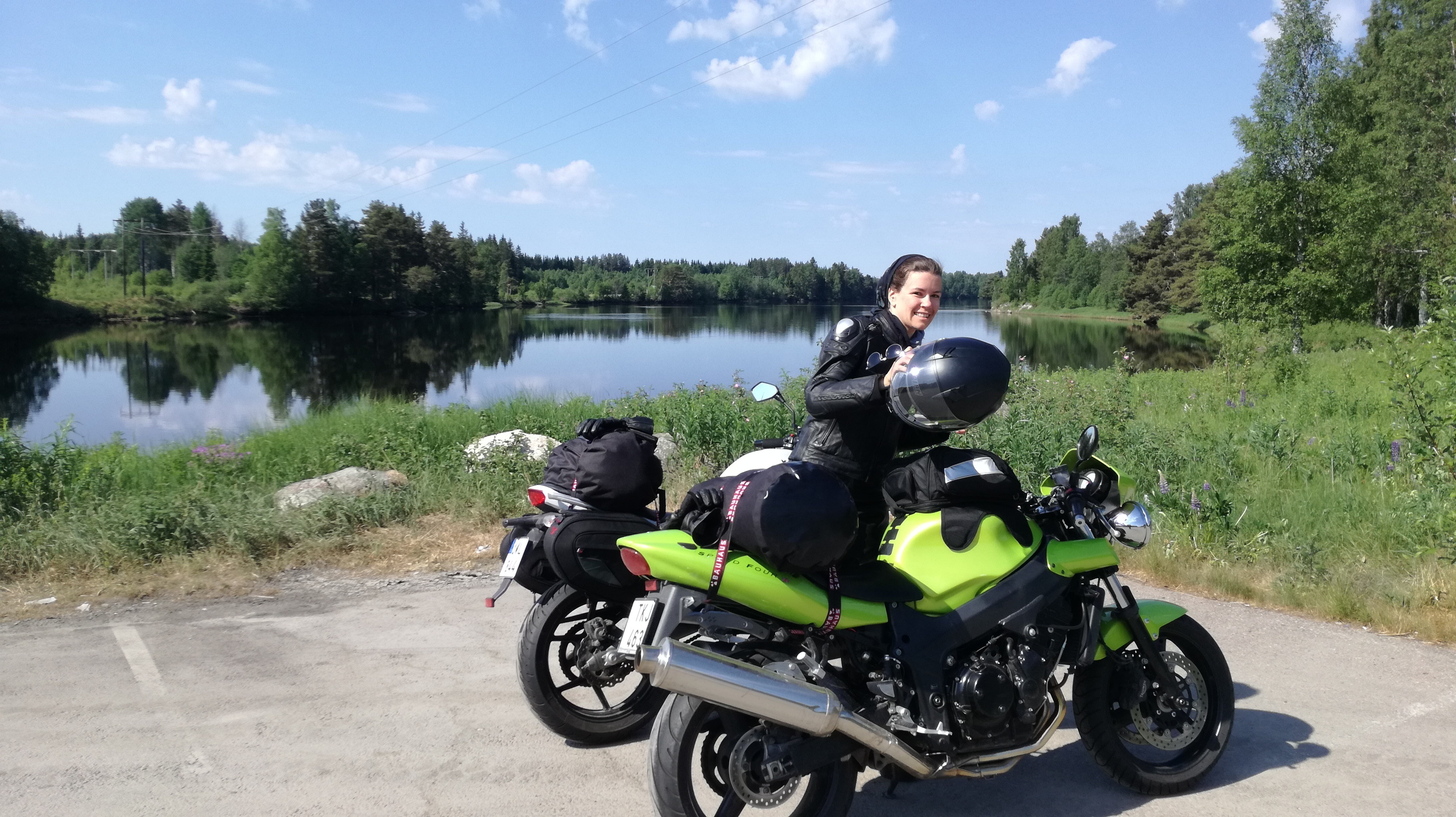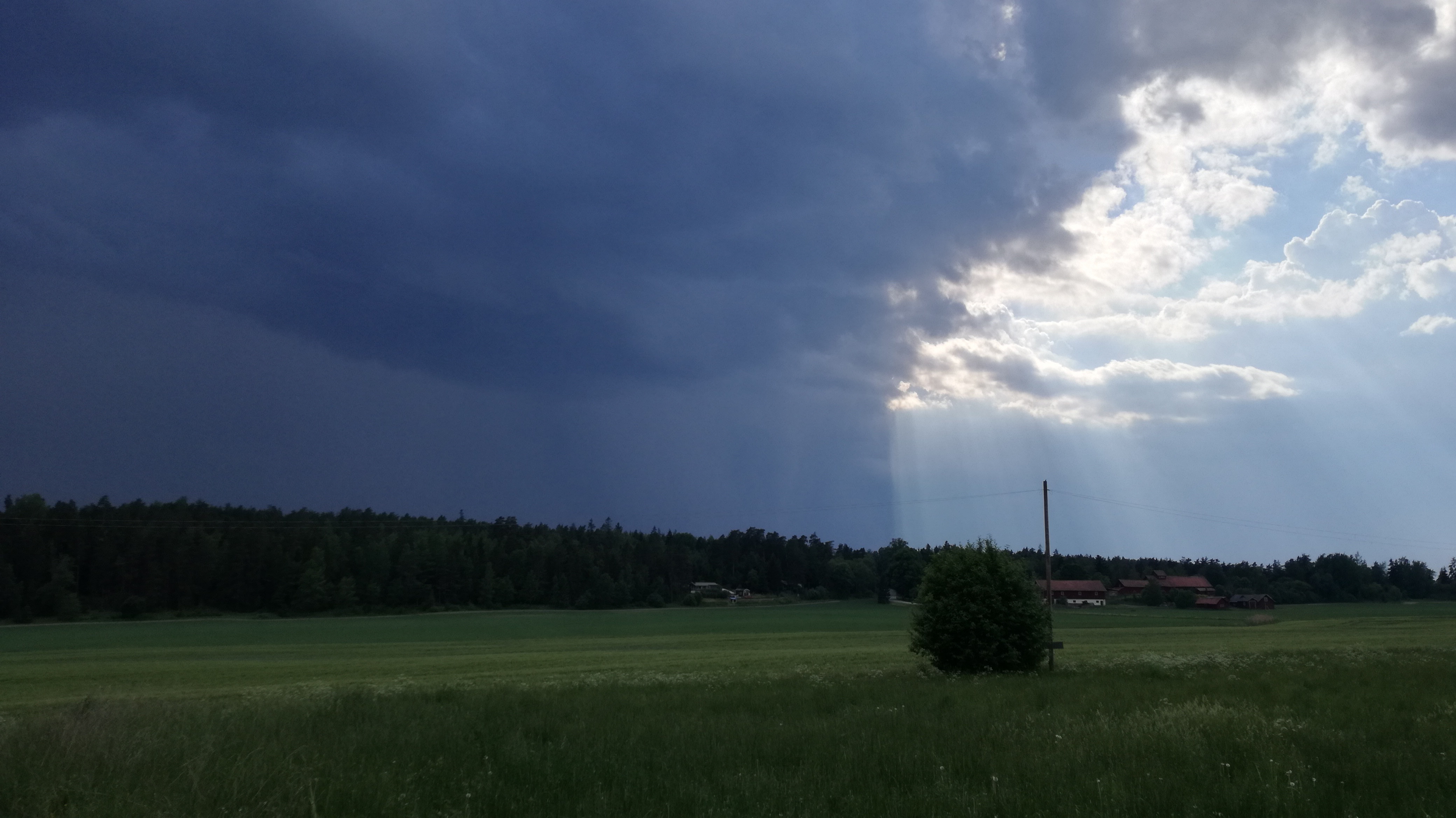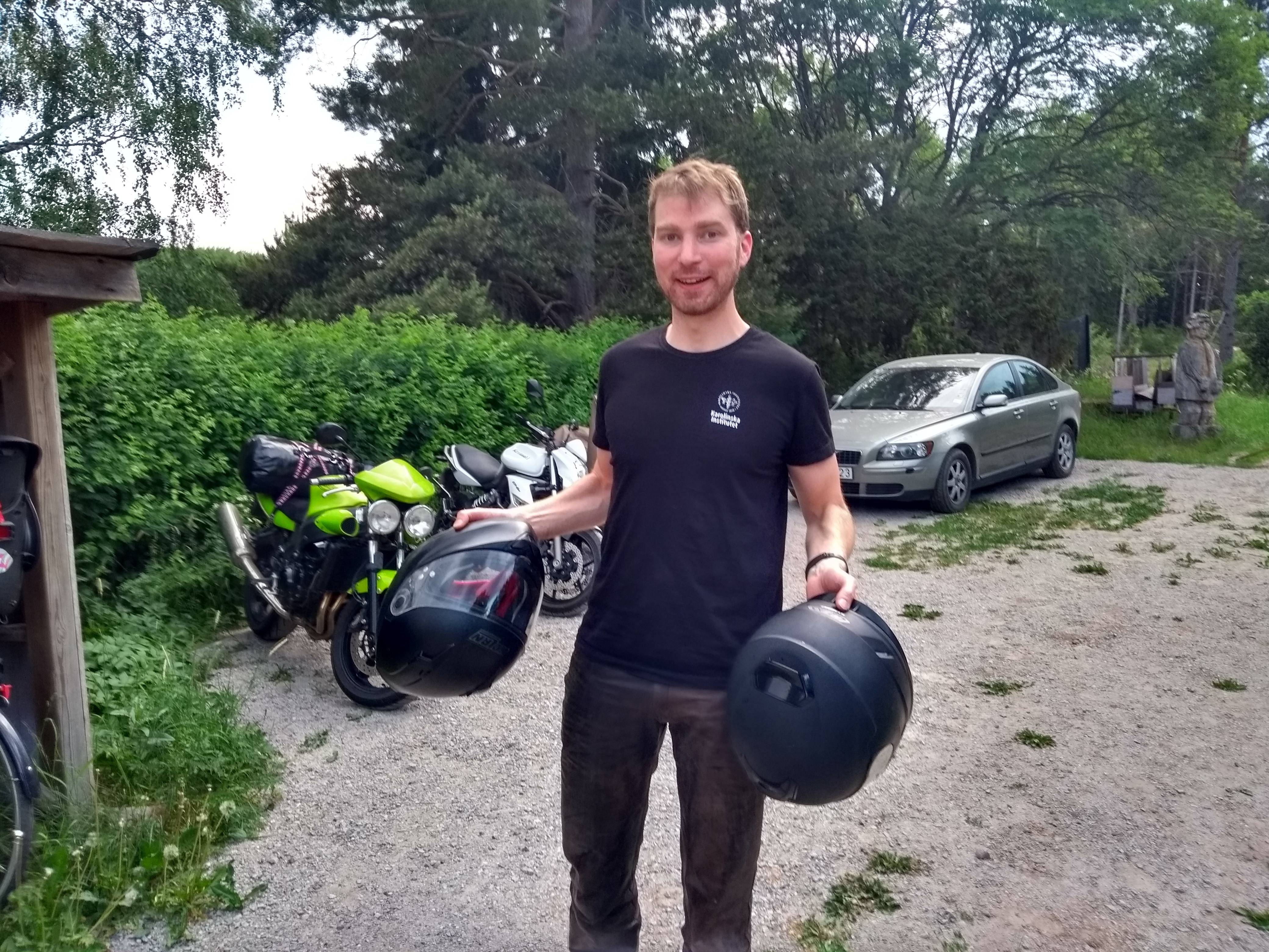 Sigtuna (erg leuk dorpje, aanrader als je in de buurt bent!), of langs het zuiden via Upplands-Bro. Aangezien ik de wegen die kant op wel een beetje ken maar niet zo leuk vind, besluiten we om bovenlangs te rijden. Uiteindelijk is dit onze redding geweest: hoewel we de hele tijd onweer zien en horen, en de donkere wolken vlakbij zijn halen we onze bestemming zonder nat te worden. We beginnen net de tassen af te zadelen als de eerste spetters vallen. Ik ren nog een laatste keer op en neer om de helmen op te halen terwijl Mrs. FragFrog haar bagagerol loshaalt en dan staan we net binnen als de bui echt goed losbarst: