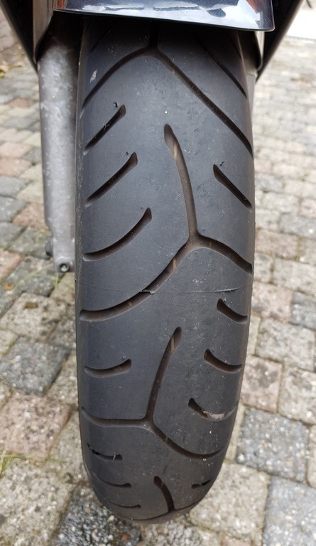 De voorband heeft wettelijk gezien nog voldoende profiel, maar deze is wel heel puntig afgesleten en flink aan het cuppen. Ook wil ik de Metzeler Roadtec 01 gaan proberen, en dan vervang ik liever de complete set in een keer. Deels is dat nieuwsgierigheid, en ik hoop stiekem ook een beetje dat de achterband wat langer mee gaat.