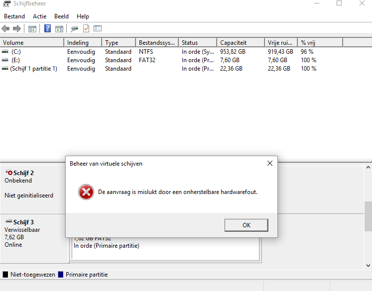 Ik heb vandaag een upgrade gedaan van een 500GB 850 Evo naar een 1TB 860 Pro. Nu wou ik mijn 850 Evo na het vervangen gaan formatteren om daarna als extra schijf te gebruiken in mijn desktop. Echter als ik de schijf aan mijn laptop koppel via een externe usb behuizing, krijg ik het volgende te zien in disk management: "De aanvraag is mislukt door een onherstelbare hardware fout." Nu heb ik gelezen dat er vaker problemen zijn met de 850 Evo, dat ze wel herkent worden in disk management maar dat booten niet meer lukt. Dit heb ik dus getest en inderdaad booten van de schijf lukt ook niet meer, de ssd wordt niet herkent in de bios. Verder las ik dat het soms aan de firmware lag van de ssd en dat je deze kan updaten met Magician van Samsung. Dit lukt echter ook niet omdat de schijf niet herkend wordt(wel ziet het programma dat er een onbekende schijf via usb is aangesloten.)