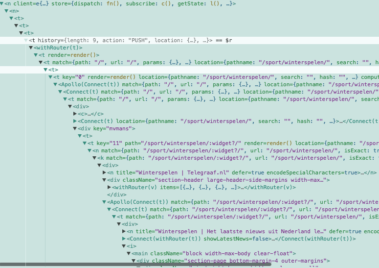 Wat mij opvalt aan de nieuwe Telegraaf site is dat je kunt navigeren zonder dat de menubalk opnieuw laadt (hij werkt heel snel zoals een app). Ik dacht: dat moet dus iets met ajax zijn, maar wat ik dan niet snap: als je het netwerkverkeer vervolgens gaat bekijken, zie je vervolgens de html-inhoud niet langskomen (tenminste, ik kon het zo gauw niet vinden).