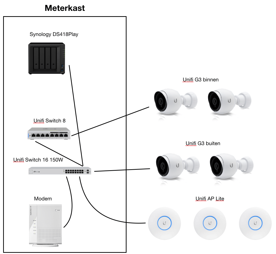 Daarbij wil ik nog een extra PoE-switch voor de camera's die binnen hangen. Deze wil ik fysiek uit kunnen schakelen als ik thuis ben, ik wil natuurlijk geen bewegingsmeldingen als ik thuis ben, en tevens vind ik het geen fijn gevoel als er iemand mee kan kijken. Het uitschakelen zou ik willen doen met iets van een smart stopcontact of klikaanklikuit met een schakelaar ergens.