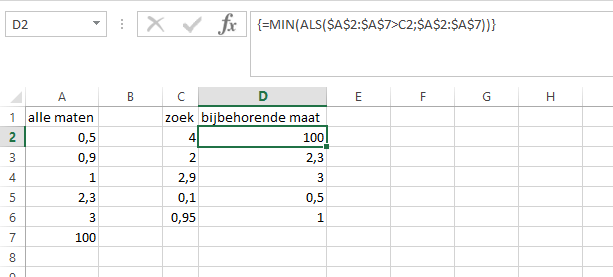 Ik wil nu dus op basis van verticaal zoeken de prijs vinden alleen moet deze naar boven afgerond worden. Met de formule verticaal zoeken en bij benaderen WAAR geeft Excel de prijs van 2.8 weer, terwijl ik de prijs van 3,0 terug wil hebben. How to fix?