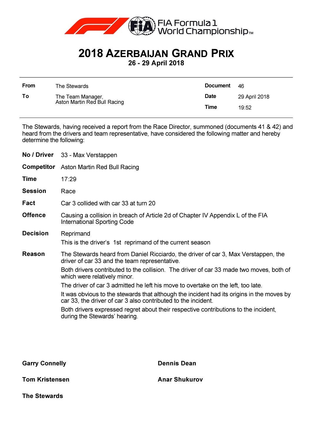 Reprimand for Verstappen. Stewards say both to blame. Verstappen made two "relatively minor" moves but Ricciardo admitted he left his final move too late