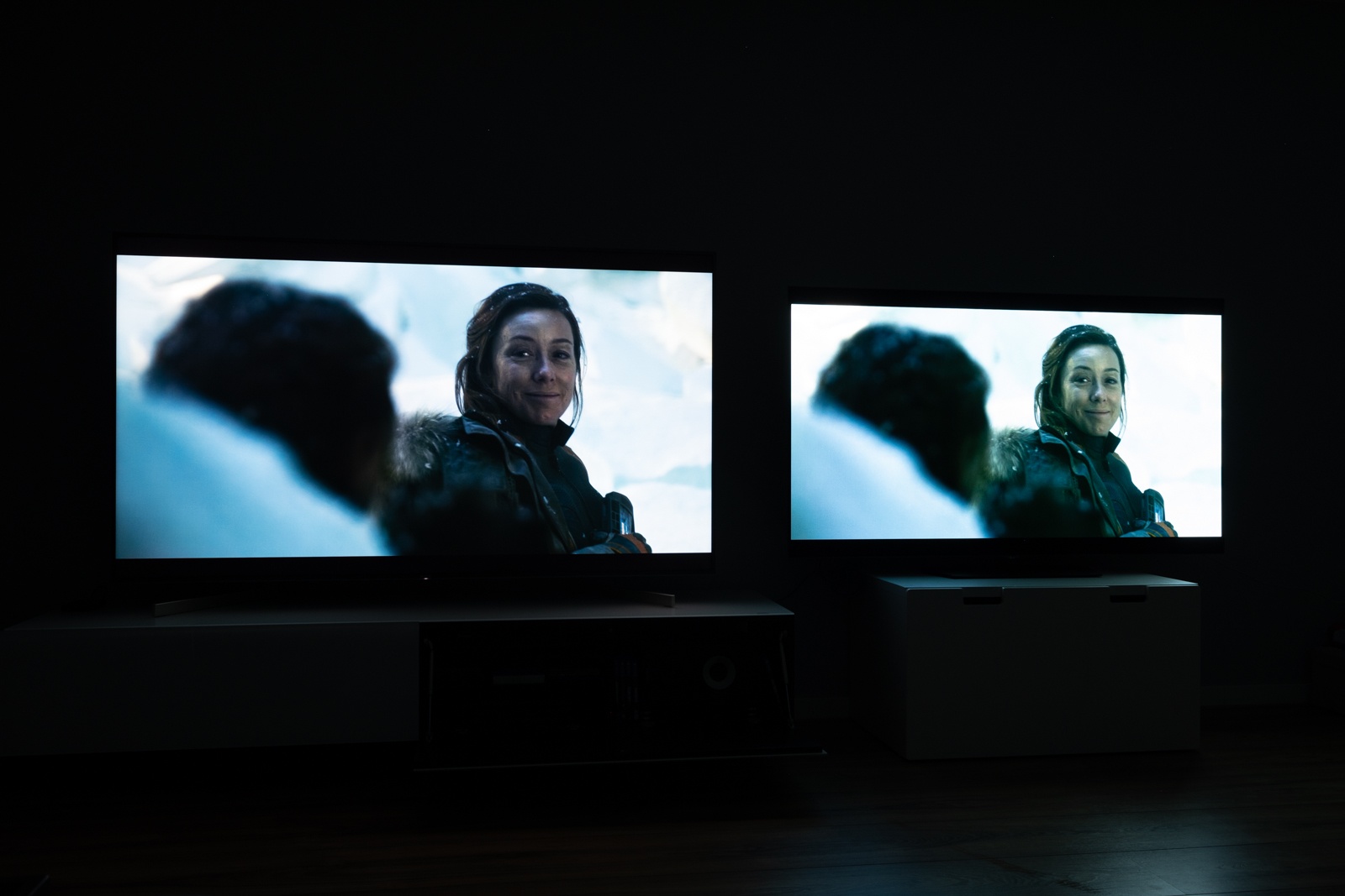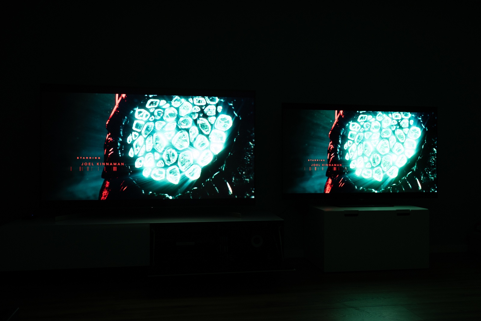 Ook met een 1080p Blu-ray, in dit geval Star Wars - The Force Awakens zijn de verschillen in helderheid niet enorm groot, al is de Sony nu wel duidelijker in het voordeel. De eerste foto laat beide TV's zien waar de helderheid gelijk is afgesteld en op de foto daaronder staan beide TV's op maximale helderheid ingesteld. Op beide foto's is de exposure van de camera 100% gelijk;