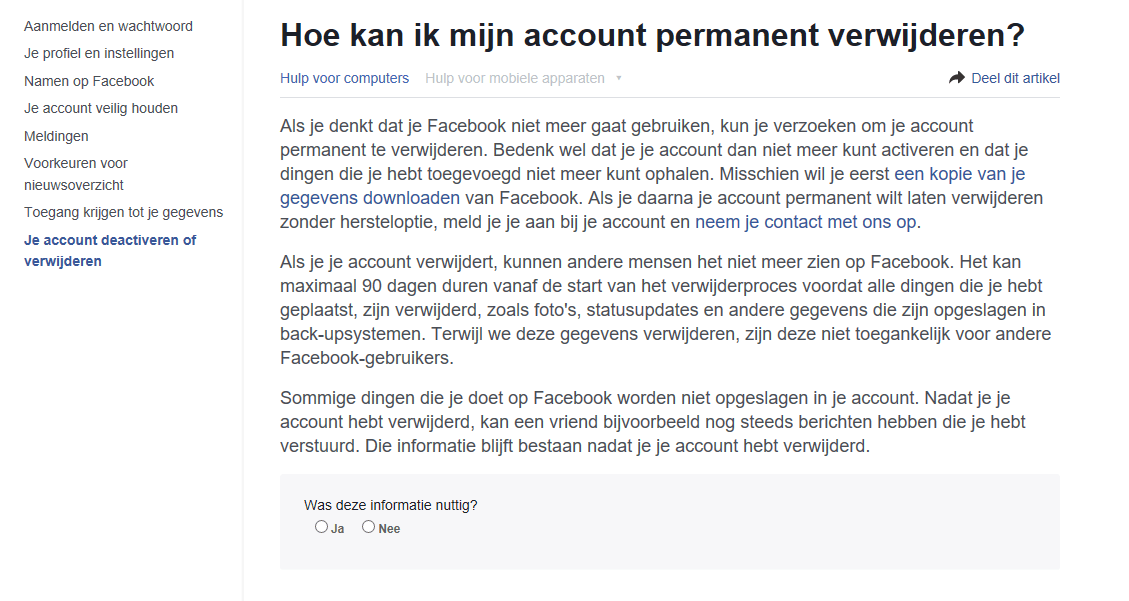 Oftewel een lange pagina met allerlei algemene informatie en geen mogelijkheid om mijn account te verwijderen.