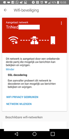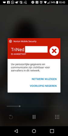 Ik krijg sinds vanmorgen meldingen op mijn Android telefoon (LG G6) over een aangetast wifi-netwerk, waarbij derden toegang zouden hebben tot mijn netwerk. De meldingen lijken afkomstig te zijn van Norton (hier heb ik een abonnement op) en/of Android netwerk zelf. Voor de privacy heb ik mijn netwerknaam en die van mijn buren uit het screenshot geknipt. Vanzelfsprekend heb ik gegoogeld, maar ik krijg dan vanzelf allerlei links om netwerken te gaan hacken, maar geen oplossingen. Ik heb ook in de webinterface van mijn fritzbox gekeken, maar daar weet ik eigenlijk niet wat van belang is. Ik maak gebruik van glasvezel internet van Trined. Mijn laptop - die ook via wifi verbonden is en ook Norton draait (idem met abonnement; Windows 10), geeft geen meldingen. Enkel de Android telefoon. Alle software is up to date. Norton wil me een VPN abonnement aansmeren, maar die heb ik al (alleen nog niet in gebruik). Normaal krijg ik NOOIT deze meldingen van Norton; enkel dat alles netjes draait en veilig is. Nu elke 5 minuten dat er dus gevaar is/dreigt.