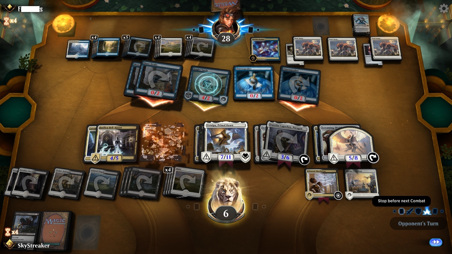 ...Het enige wat ik niet prettig tot zover vind is spelen tegen zijn tokendecks, omdat ik dan zoveel in iemand anders zijn beurt op de knop resolve moet drukken. Irritant is dat, maar automatiseren doe ik nog niet want wat als de tegenstander er wat spells tussendoor gooit die ik dan niet meer kan counteren ofzo. In dat opzicht is spelen tegen Ajani-decks wel irritant en laat deze nou net in zijn op Arena.