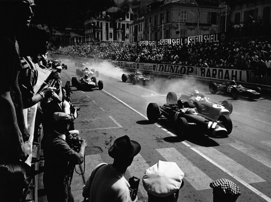 1966 Monaco, Jackie Steward wint in BRM P261. Startfoto staat JS niet, wel staan op deze foto: Graham Hill (BRM P261, #11), D. Hulme (Brabham BT22 #8), L. Bandini (Ferrari 246 #16) & B. Anderson (Brabham BT11, #15) - Sainte-Devote. - via TheBishF1 (Matt Bishop):
