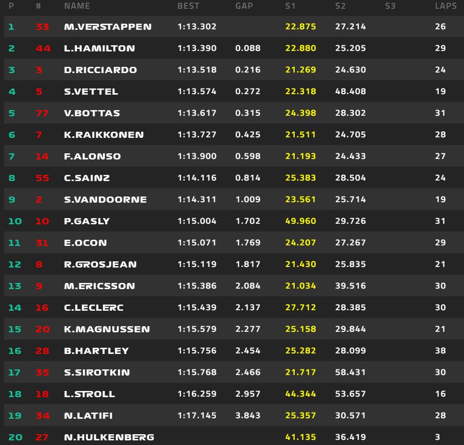 Wat is er met Ricciardo? Die zit totaal niet bij de snelste tijden? Ook Raikkonen zit er nog ver vanaf (en Vettel moet nog).