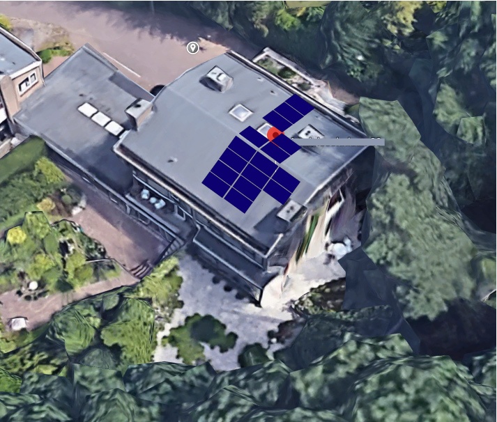 De richting van het dak is ZW. Google maps staat naar het noorden. Het dak heeft niet al te veel bruikbare ruimte en zoals te zien is staan er een aantal bomen. De helling van het dak is 45 graden, en er zit een redelijk forse dakkapel op.