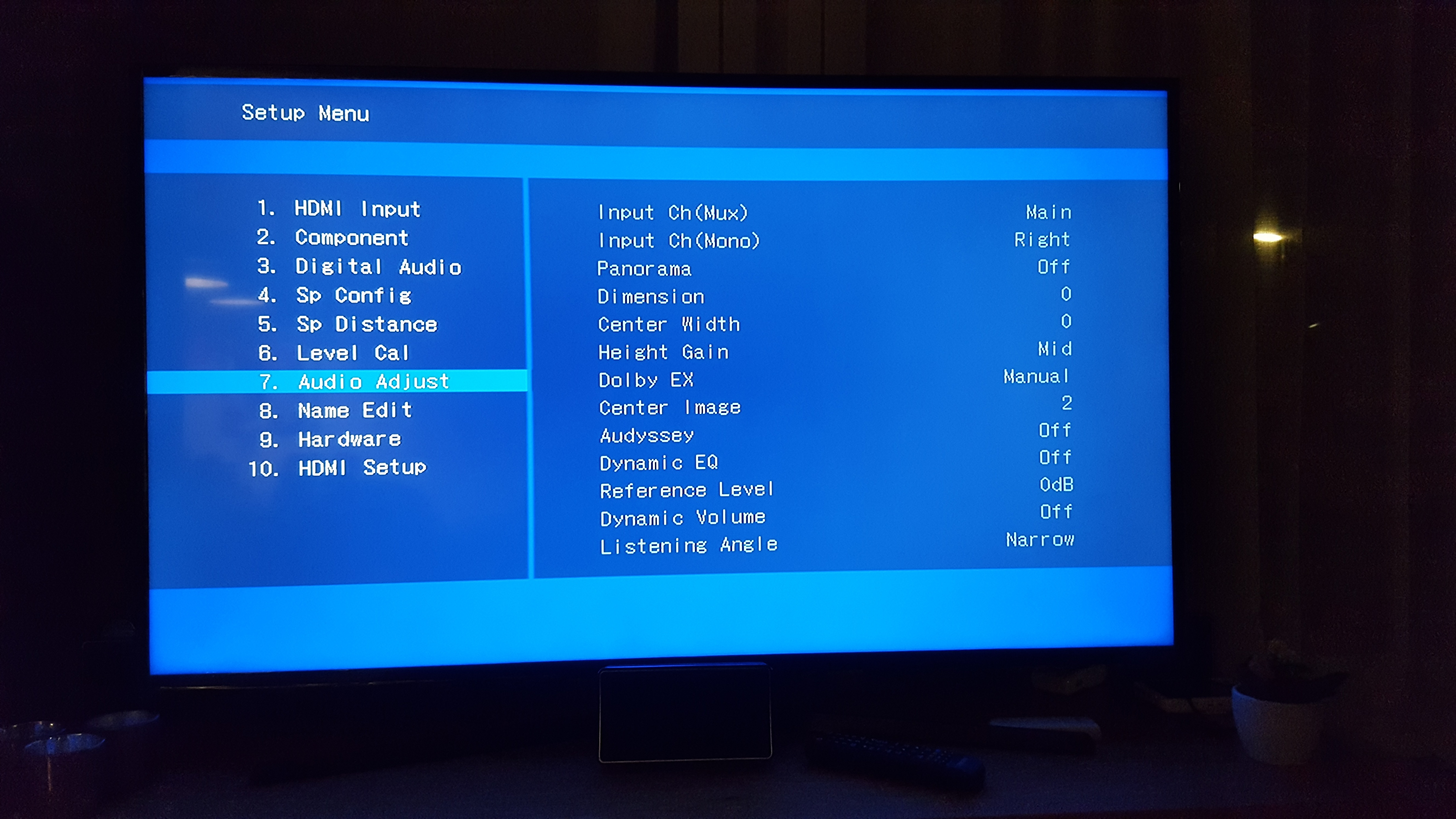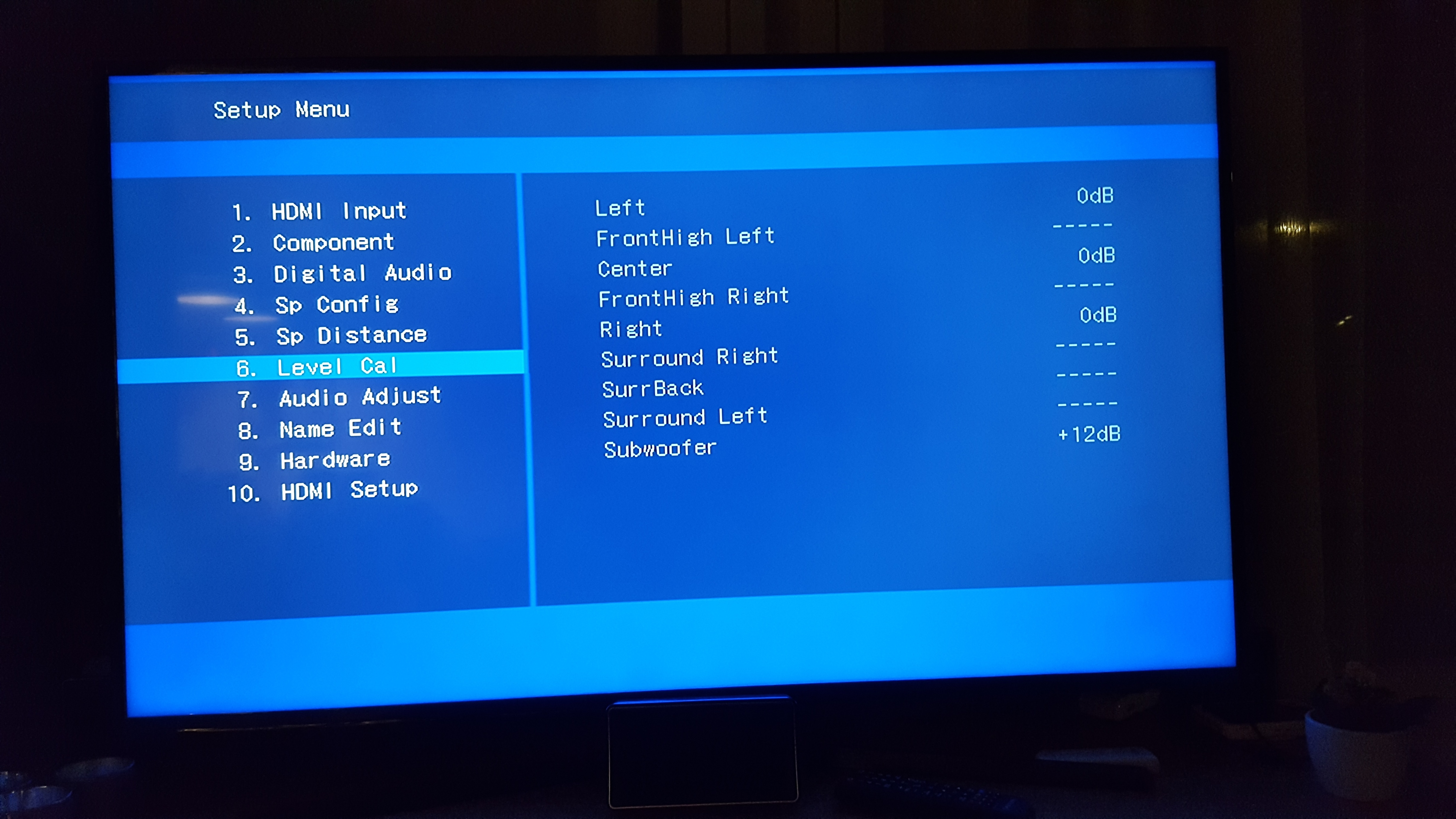 - Speaker settings gecontroleerd: Front en surround op small, subwoofer op yes, speaker levels op 0